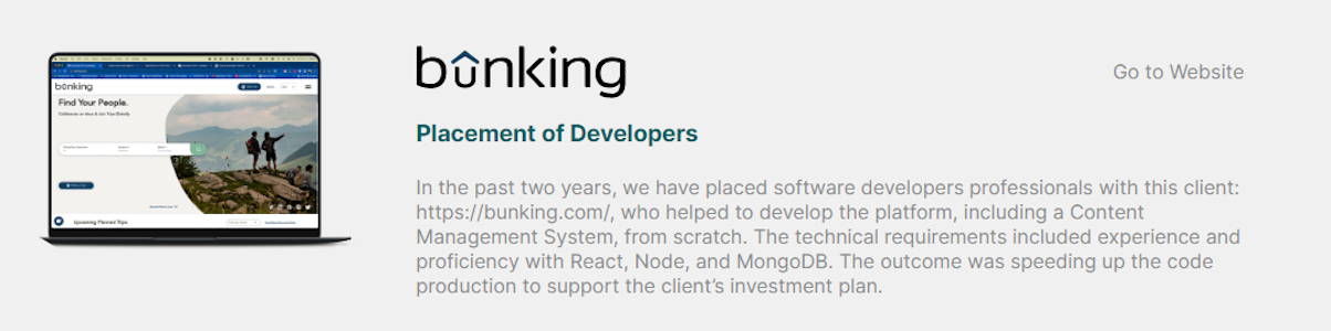 We decided to hire Maria’s wonderful team at DMLA to help increase our development velocity and code quality with three of their Full Stack Developers. We could not be more satisfied with the level of service from Maria and the quality of the developers we were working with. It completely takes away the worst-case scenario of hiring a Development Company that so many of us have heard horror stories of. I will endorse DMLA to any company that is looking to partner with talented and caring people.