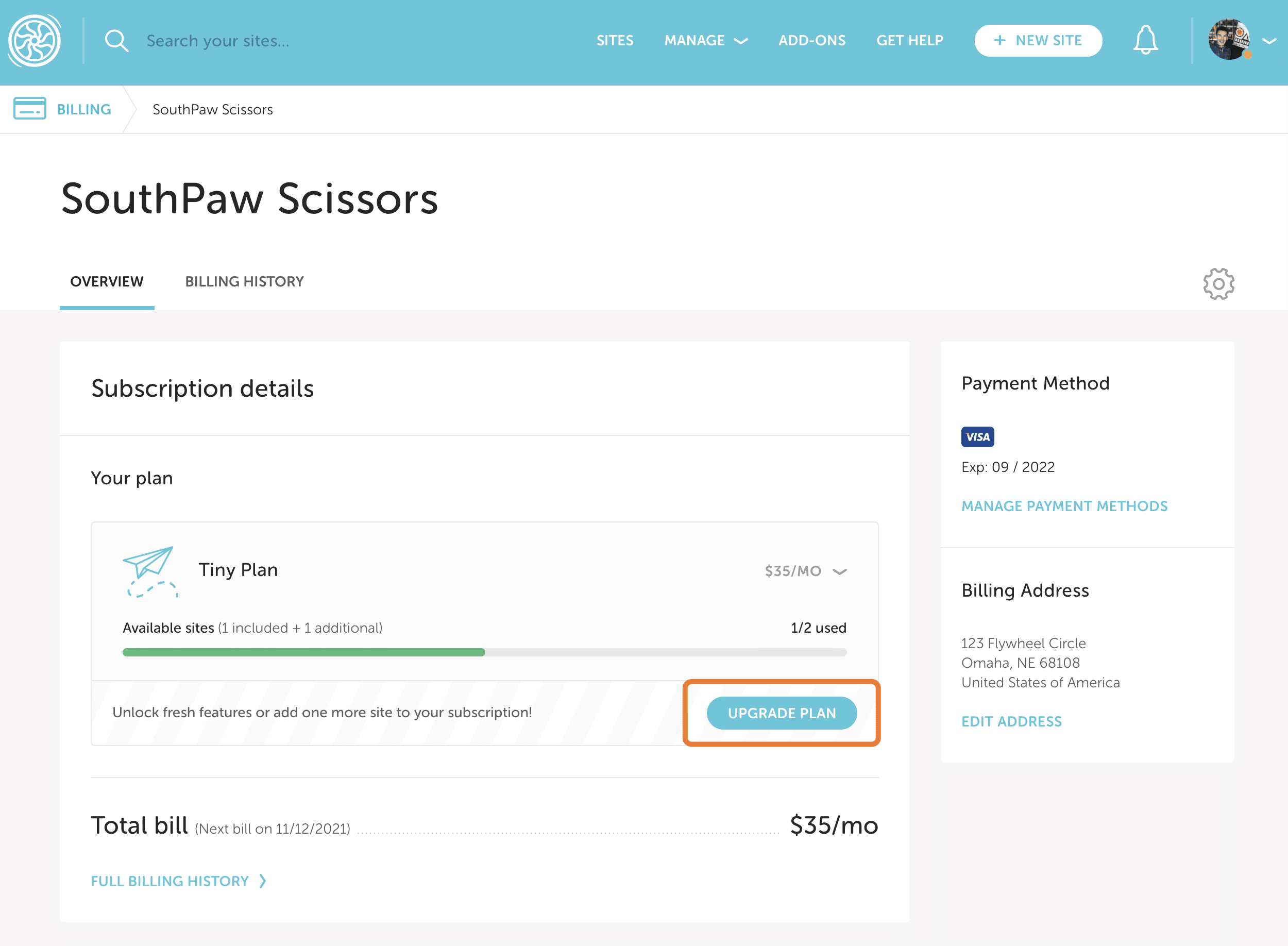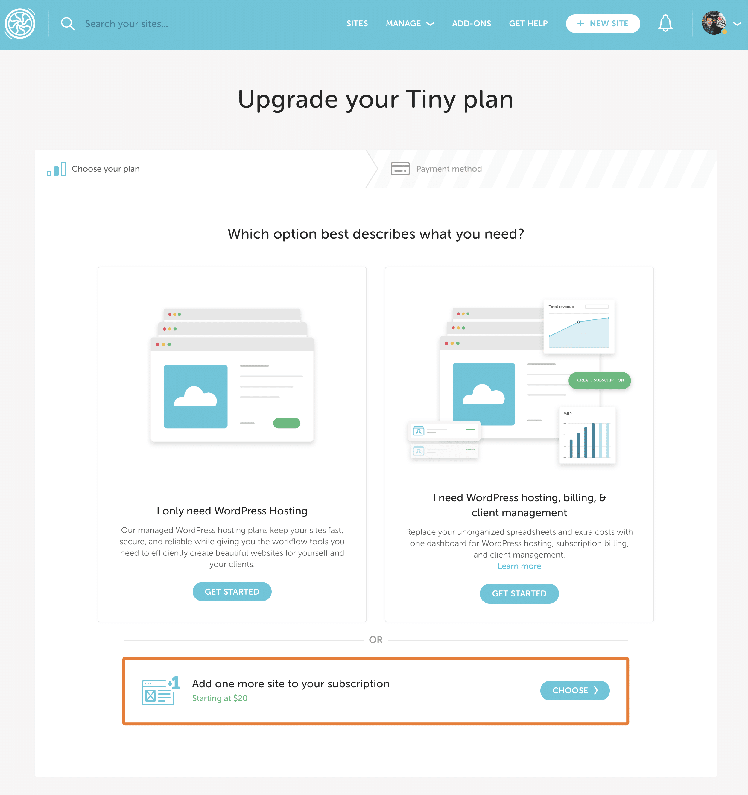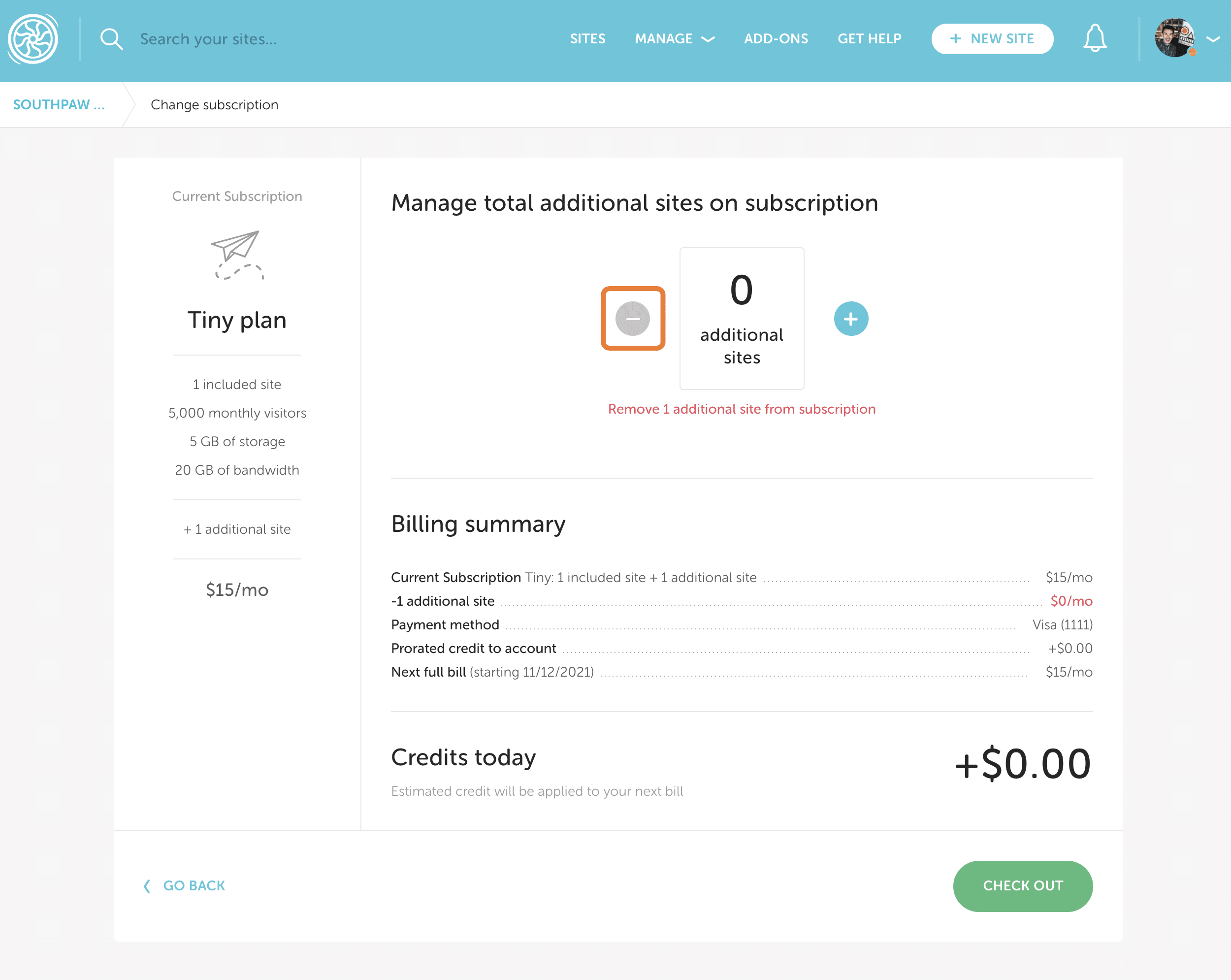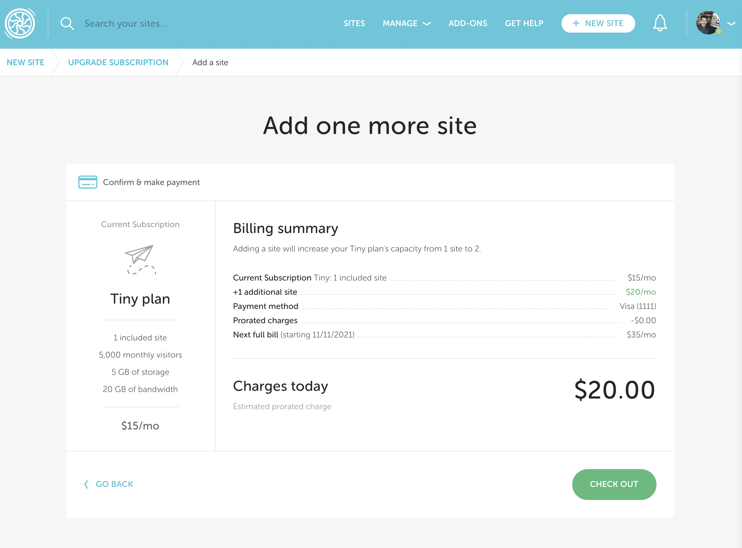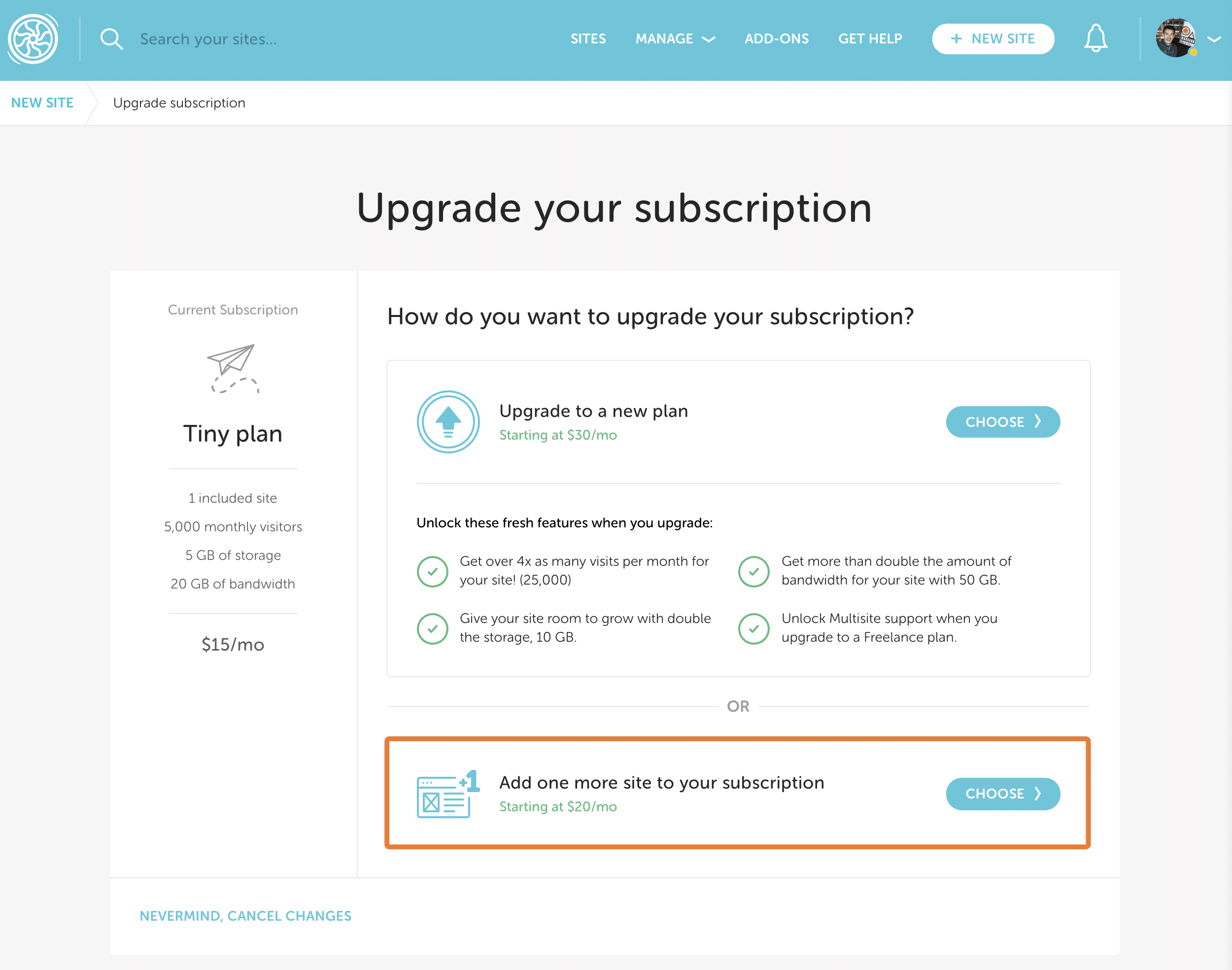 For example, if you add an additional site to a Starter plan, you can spin up two sites instead of one. Keep in mind, visit and storage allowances are shared across all sites on the subscription.