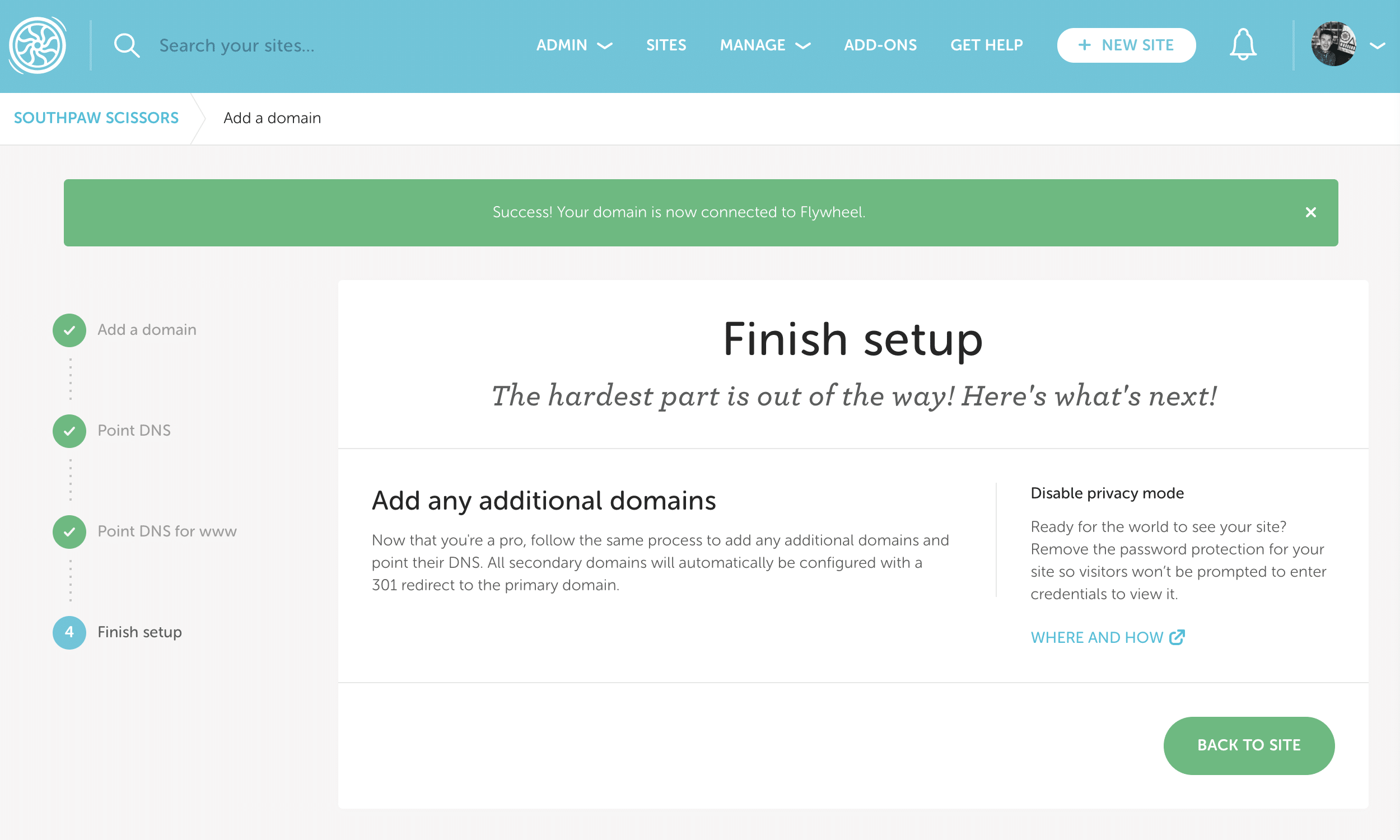 Once DNS is updated at Cloudflare, you’ll be taken back to the Flywheel dashboard. Click Back to Site to return to the Overview page.