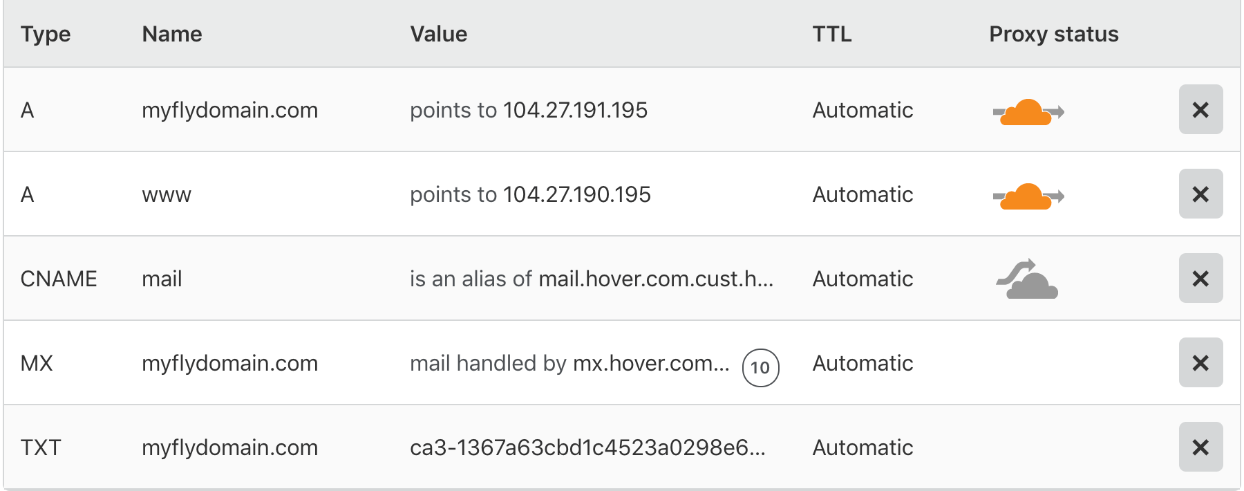 Note that not all records will show the Cloudflare icon in the status column; only records that control actual web traffic, which usually means A records or CNAMEs that redirect to A records. The gray cloud (or none at all) will likely show in the Status for other DNS records. That’s normal. Those will still work; they just won’t be proxied by Cloudflare.