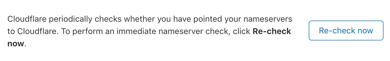 Once you’ve saved the proper Cloudflare name server values in your registrar control panel, click the “Done, check nameservers” button in the Cloudflare dashboard. Most of the time, this doesn’t take more than a few minutes, but changes affecting DNS can sometimes take up to 24 hours. In any case, there won’t be any downtime during the transfer. You can always check the progress manually by clicking “Re-check now”.