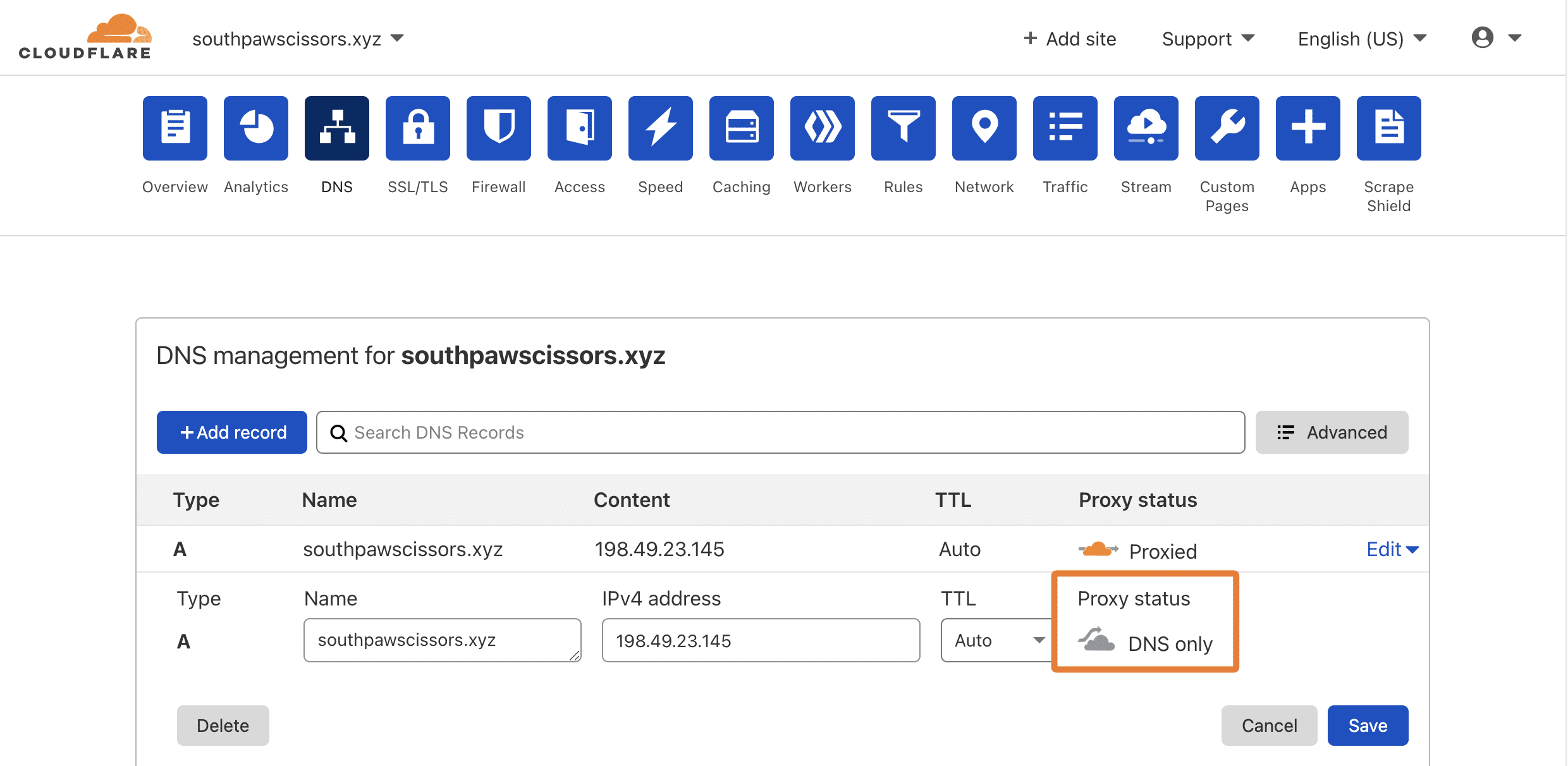 3. Under Proxy Status, click the orange cloud icon to disable Cloudflare. A grey cloud icon indicates Cloudflare is disabled for the domain.