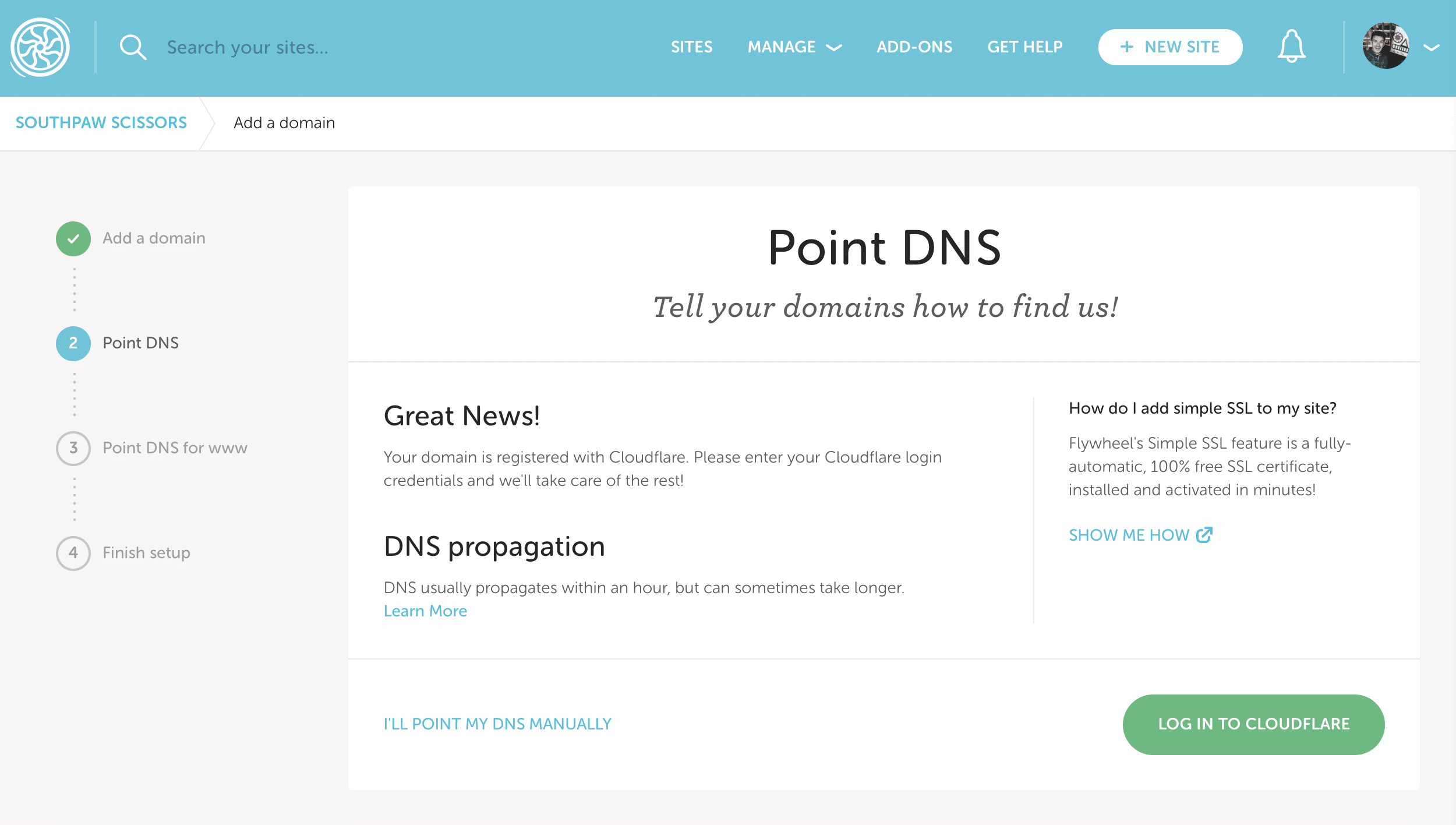 Domains managed by Cloudflare can take advantage of Flywheel’s partnership with Domain Connect, which allows Flywheel to set up DNS records with Cloudflare on your behalf.