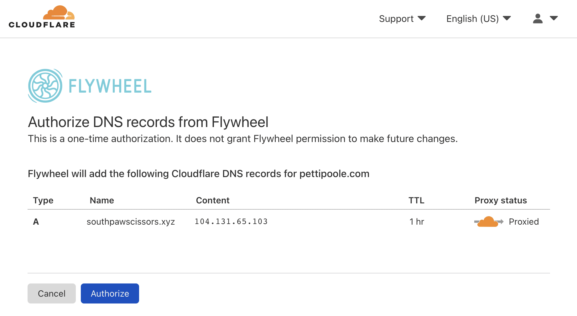 Once you’re signed in, click Authorize to allow Flywheel to make DNS changes.