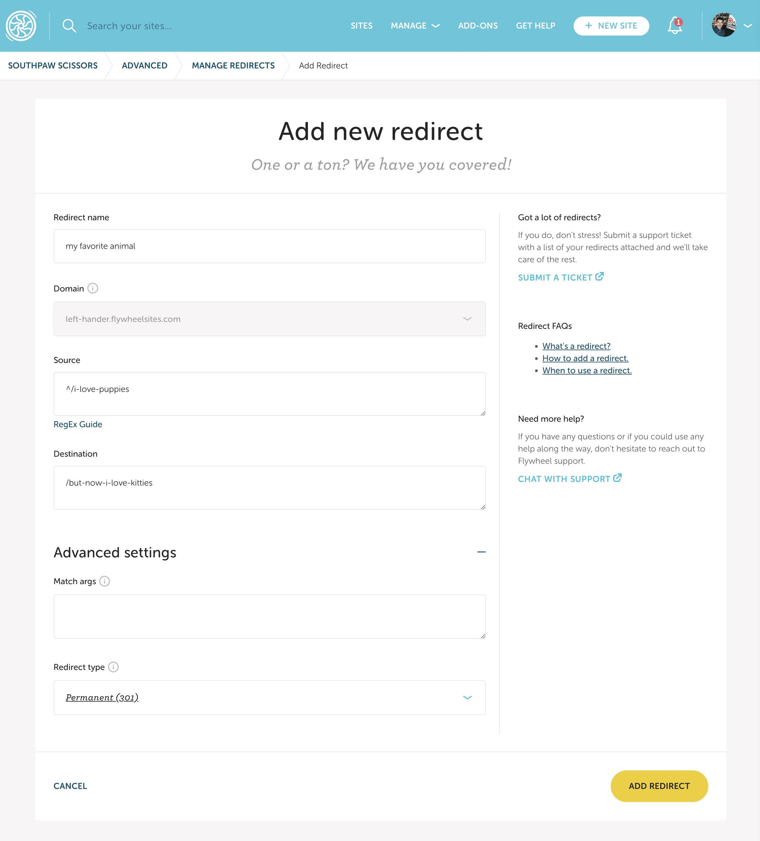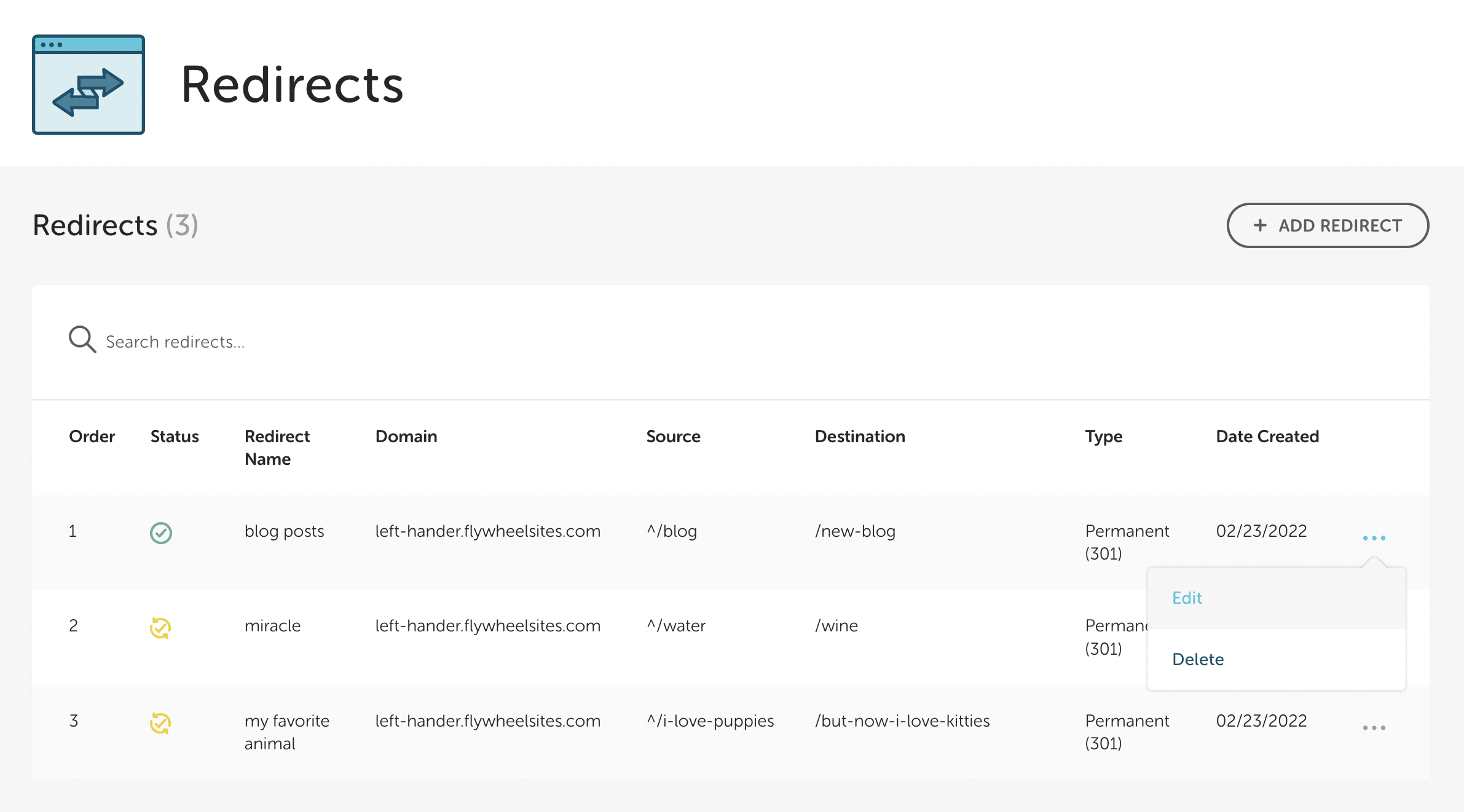 Flywheel’s Redirect feature allows you to create site redirects right from the Flywheel dashboard without using a plugin.