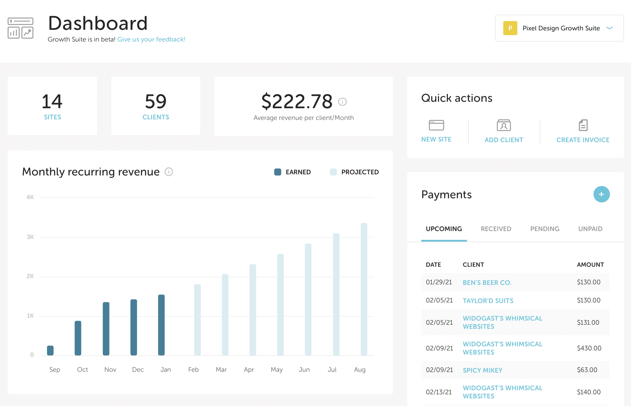 One of the best features of Growth Suite (in our opinion) is the dashboard! With the dashboard, you can view revenue trends, such as average revenue per client and monthly recurring revenue.