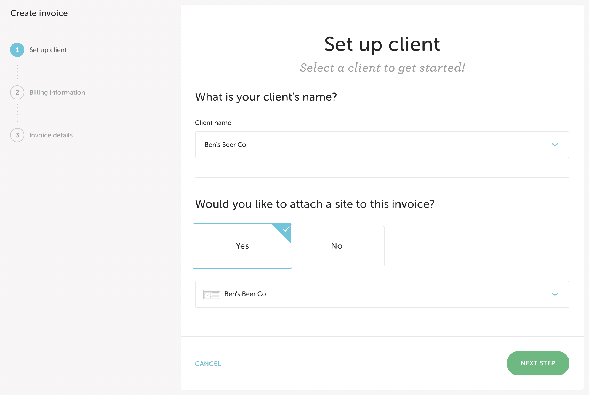 Select the client you’d like to bill and attach a site if applicable.