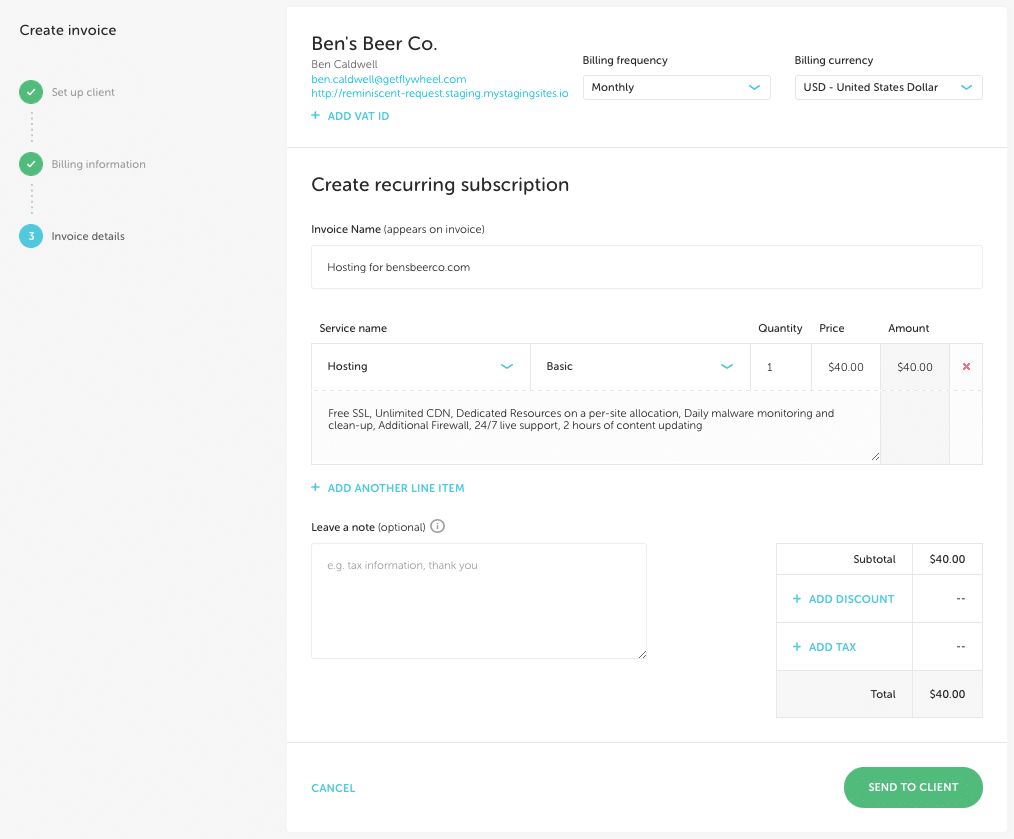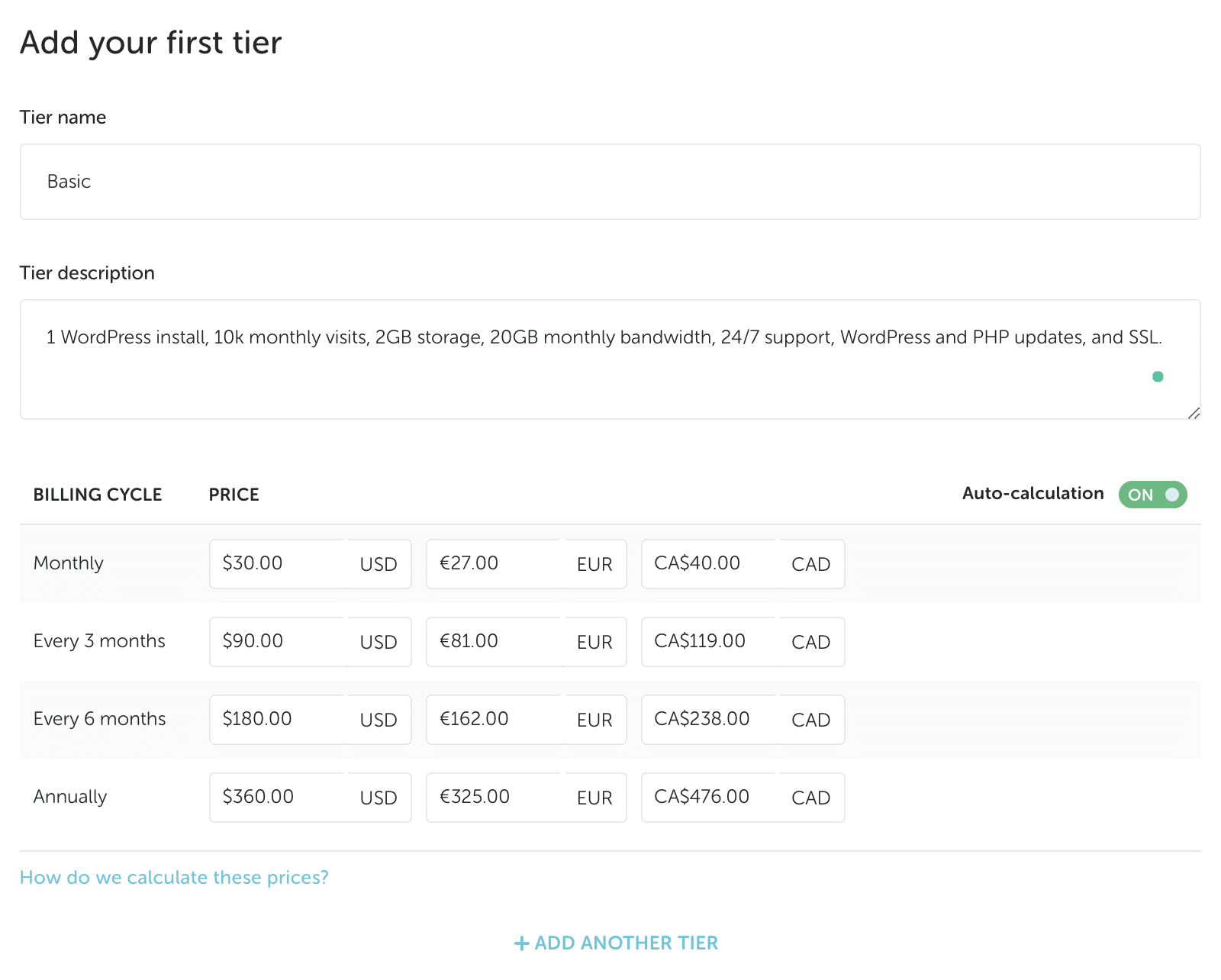 Now you can create the individual service tiers. For example, name the first tier Basic, as you’ll just be reselling all the delightful features Flywheel offers with each plan.