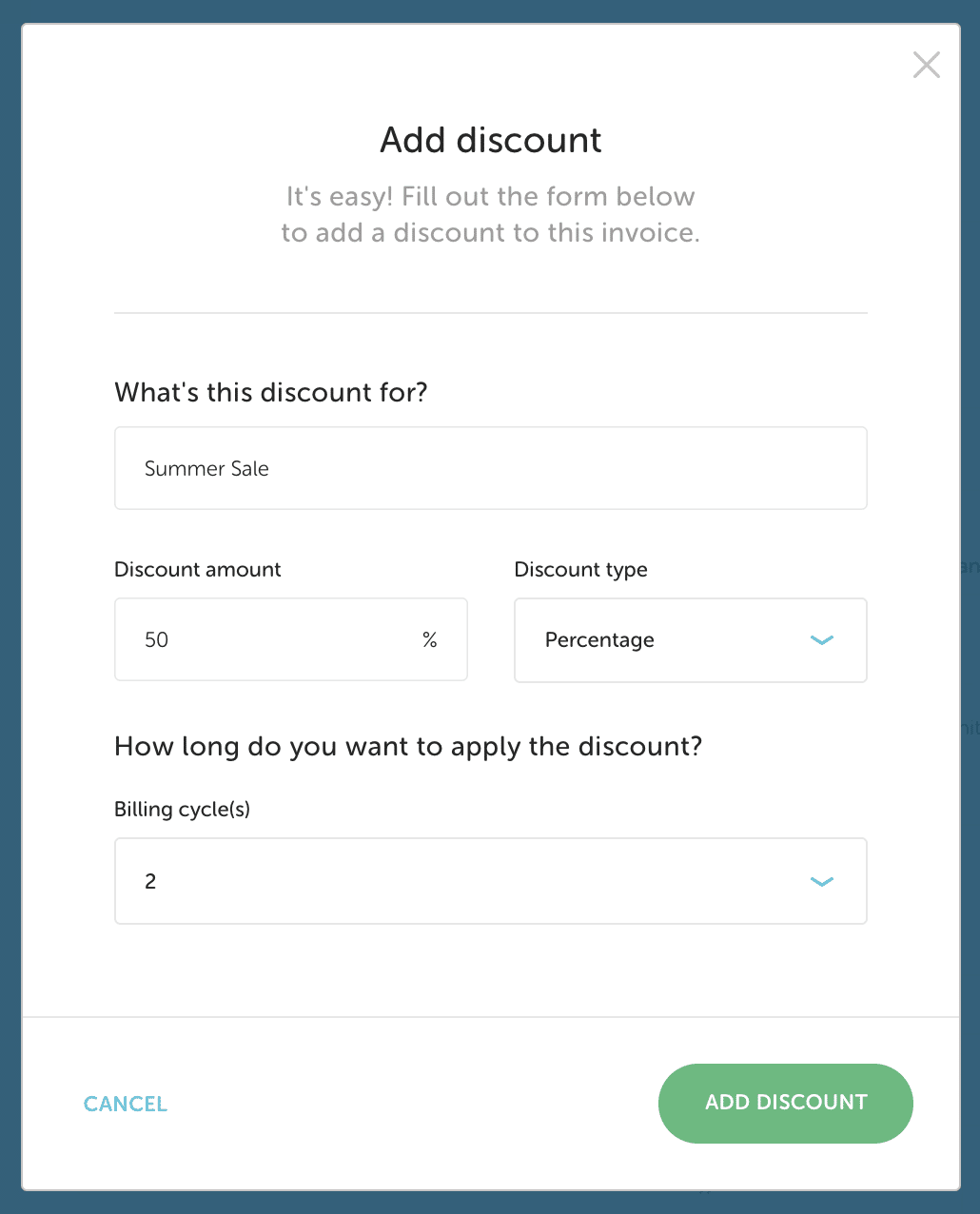 Once the services have been added, you’ll have the option to add a discount. You can choose to add either a percentage or whole amount. Then, choose how many billing cycles you’d like the discount to be applied for.
