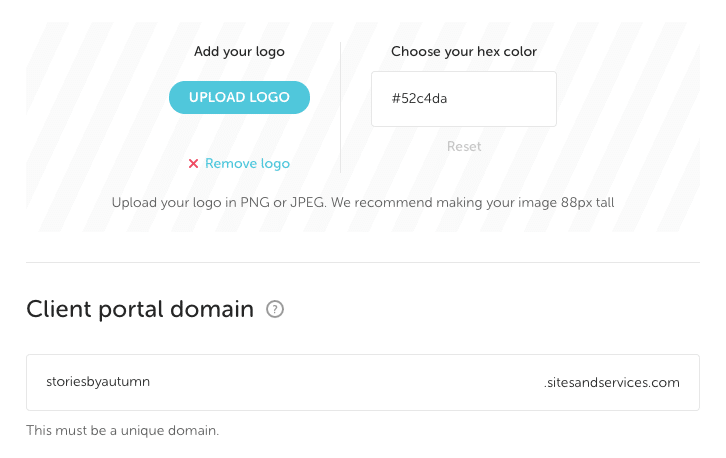 This information will show up on your client’s invoices, so make sure it’s correct! Your logo and accent color will be displayed on your invoices and in your client’s portal, while the portal URL will be how your clients access their accounts.