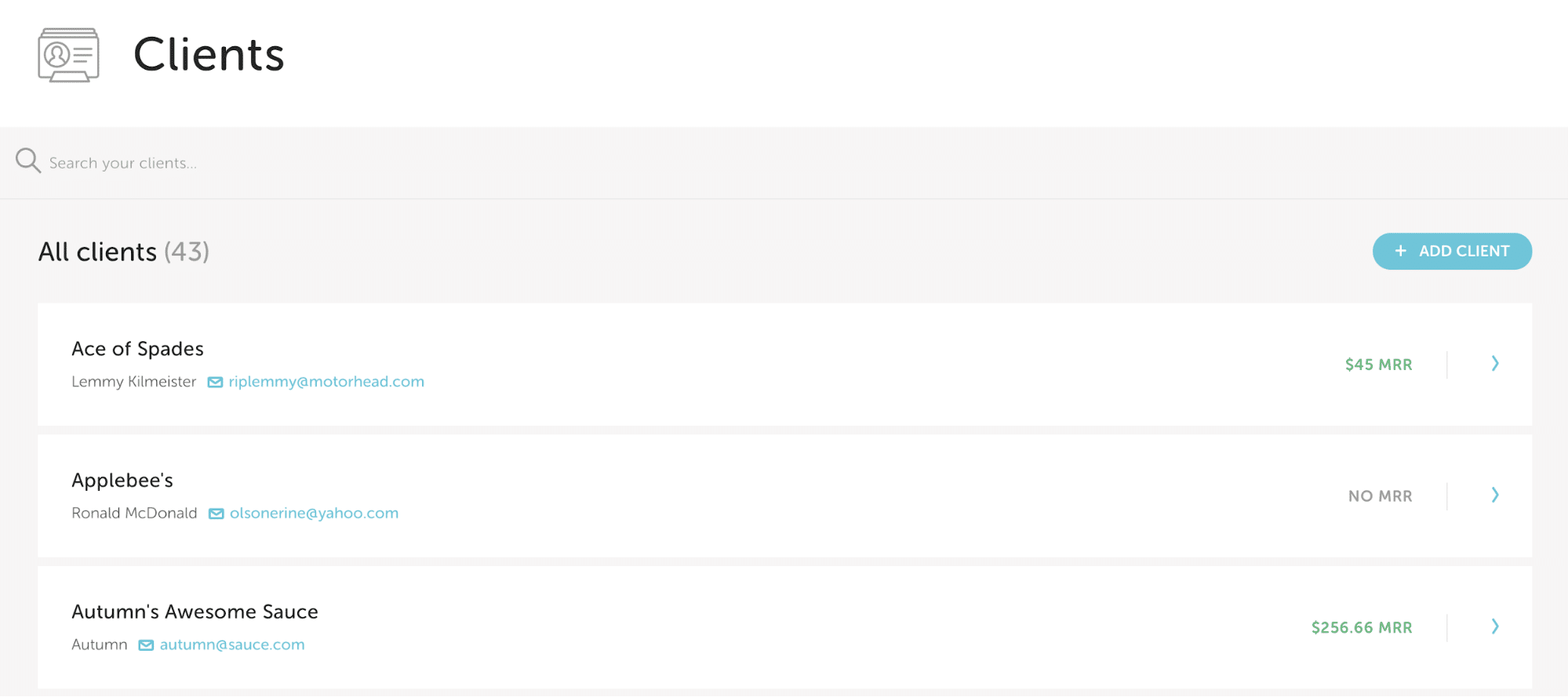 The Clients tab shows all your customers and the total monthly revenue of any active subscriptions for each.