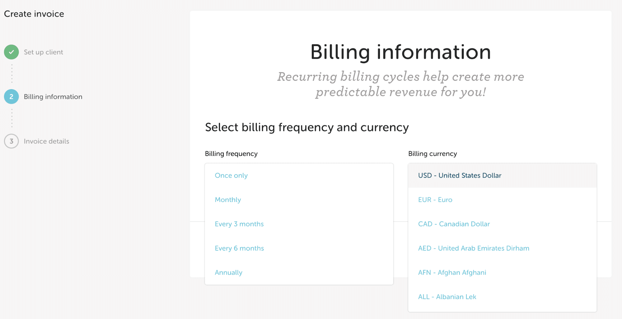 Select the billing frequency of the invoice (one-time or recurring? If recurring, how often should your client receive their bill?) and currency (what currency will you be billing this particular client in?).