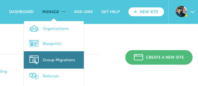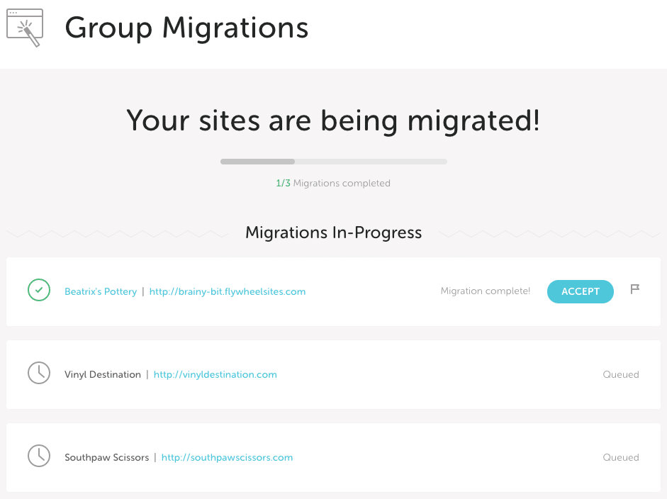 You’ll receive an email update as our team completes each individual site migration. You can also visit your Group Migration dashboard at any time by clicking Manage > Group Migration and choosing “View Progress”. When you’re ready to approve a migration to take a site live, click the “Accept” button. Or, if you find an issue with your migration, click on the Flag icon and shoot us a message with what’s going on and our team will get back with you within one business day.