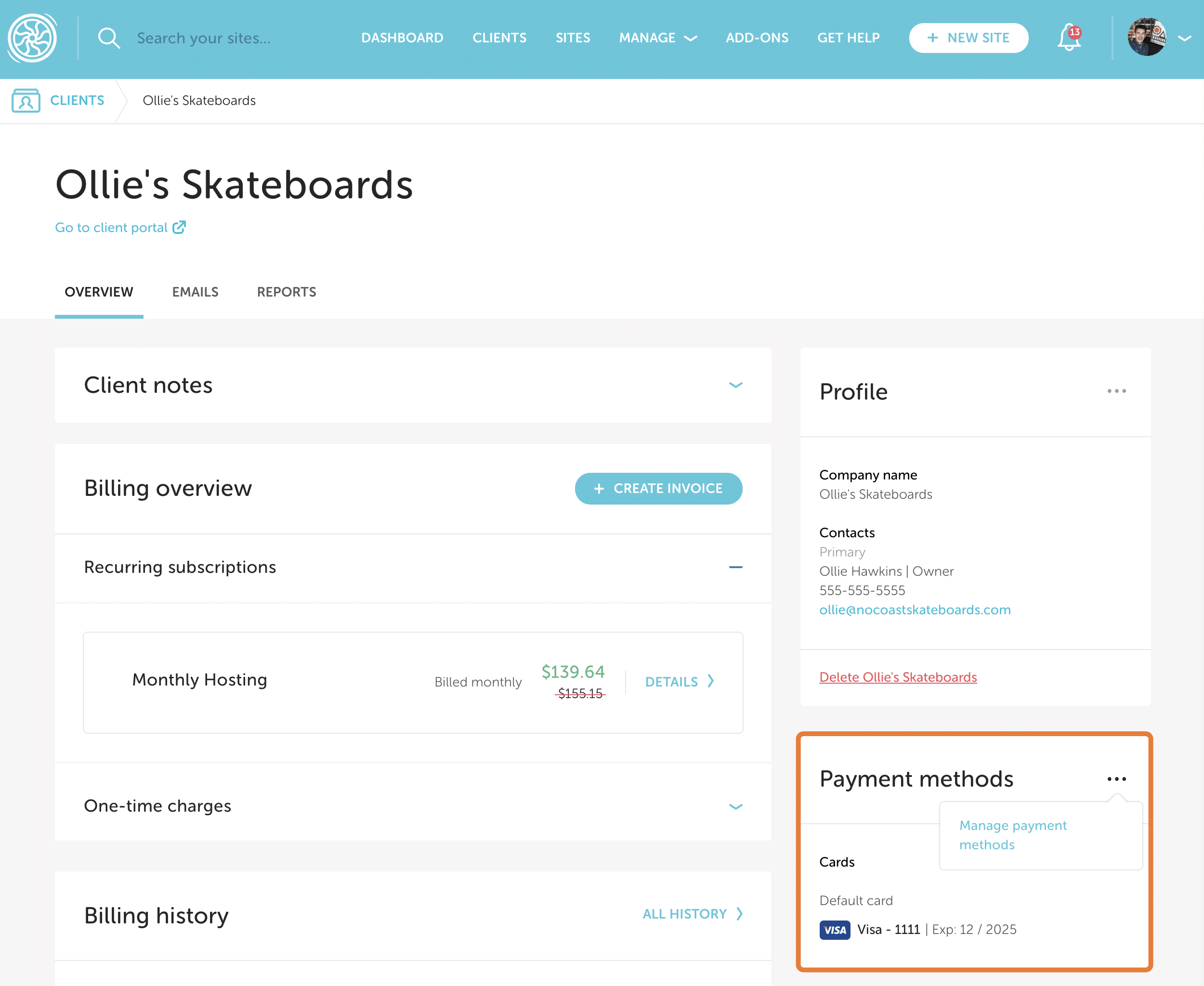 Creating a consistent and reliable payment structure for your client is a great business practice. Growth Suite allows you and your clients to manage payment methods directly from the dashboard or the Client Portal.