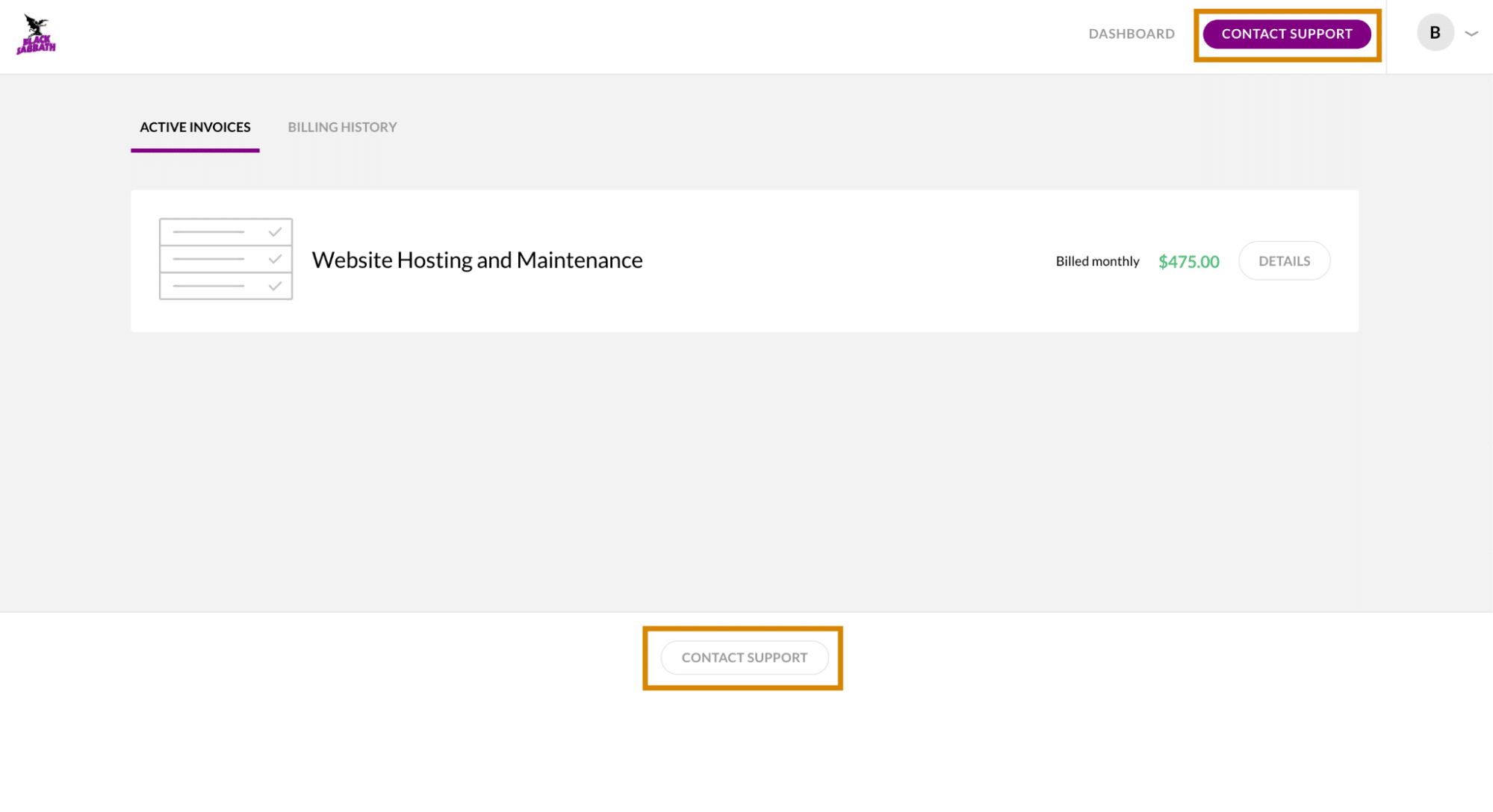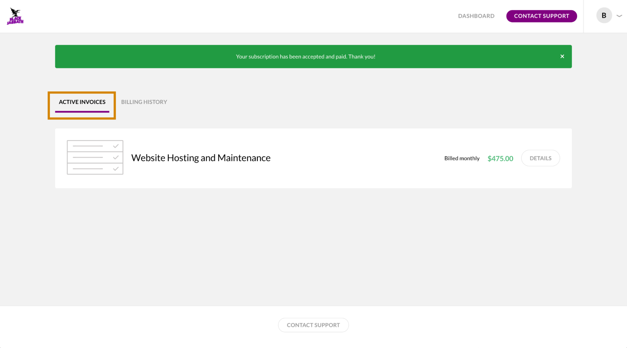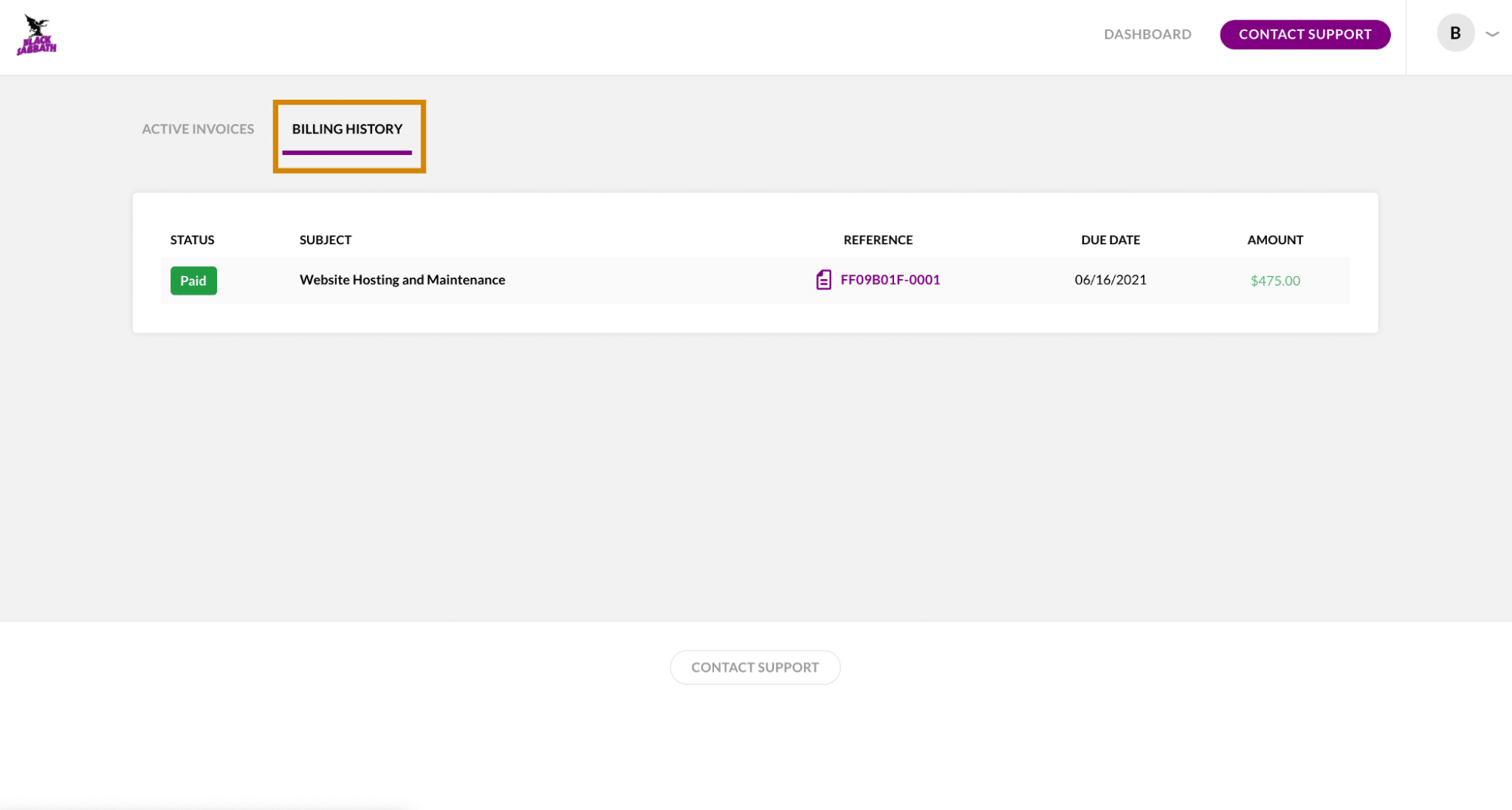 This page contains your client’s invoices and payment history. Prior invoices can be downloaded at any time.