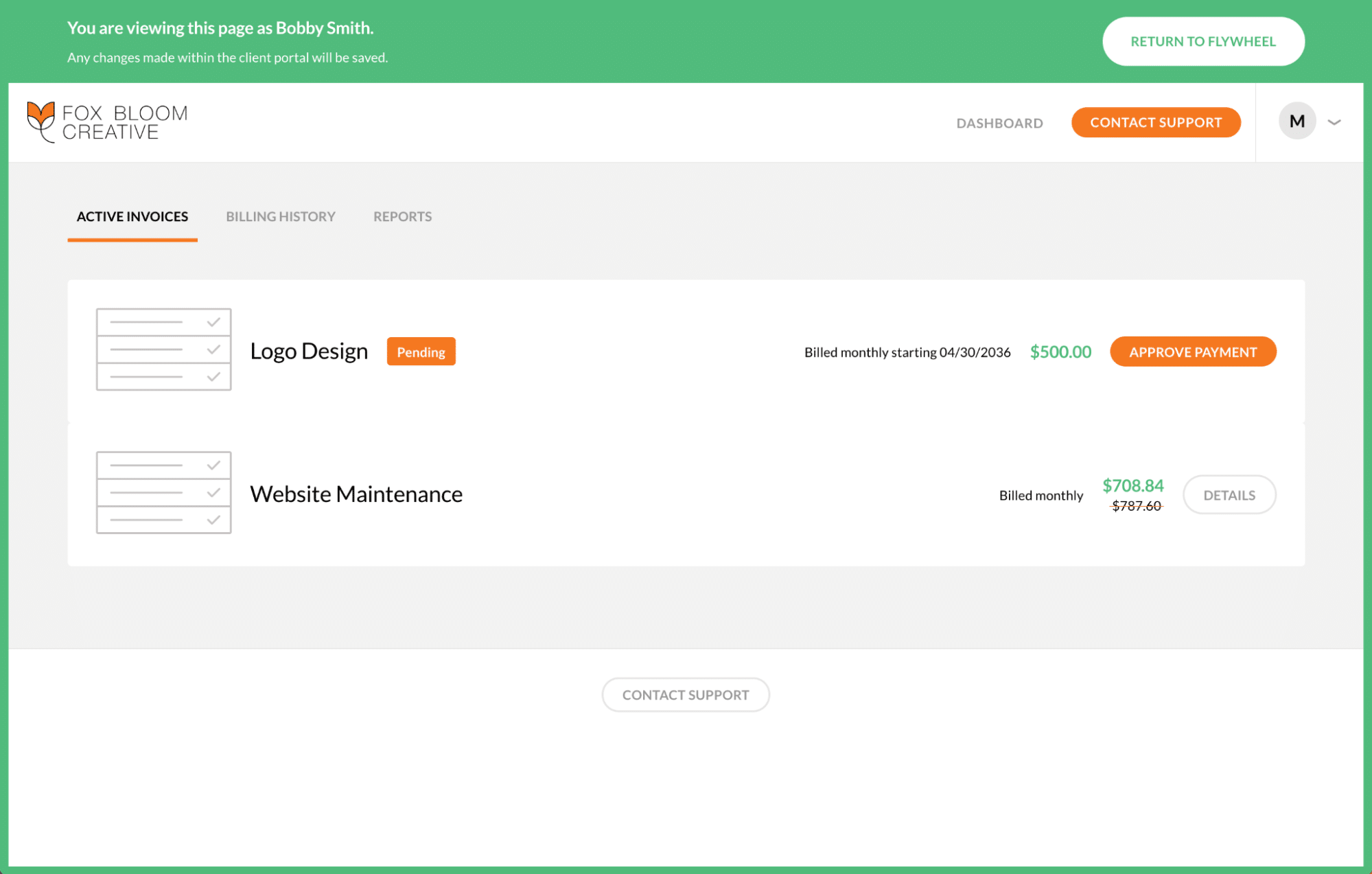 To help you aid your clients as they use the portal, Flywheel offers the ability to “shadow” (or preview) their portal. Shadow Mode allows you to browse and view the portal exactly as your client sees it, and even make certain changes (not billing) on their behalf.