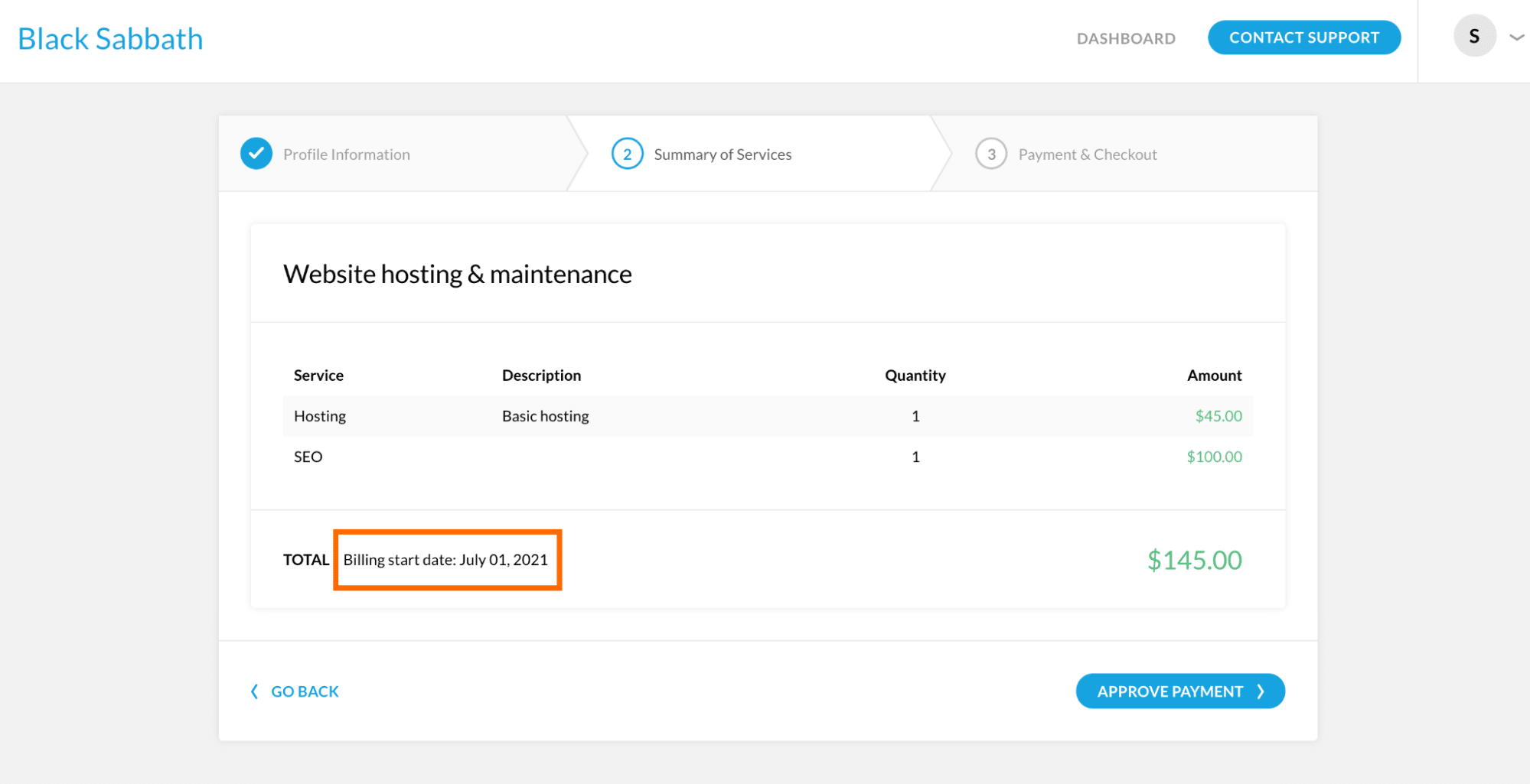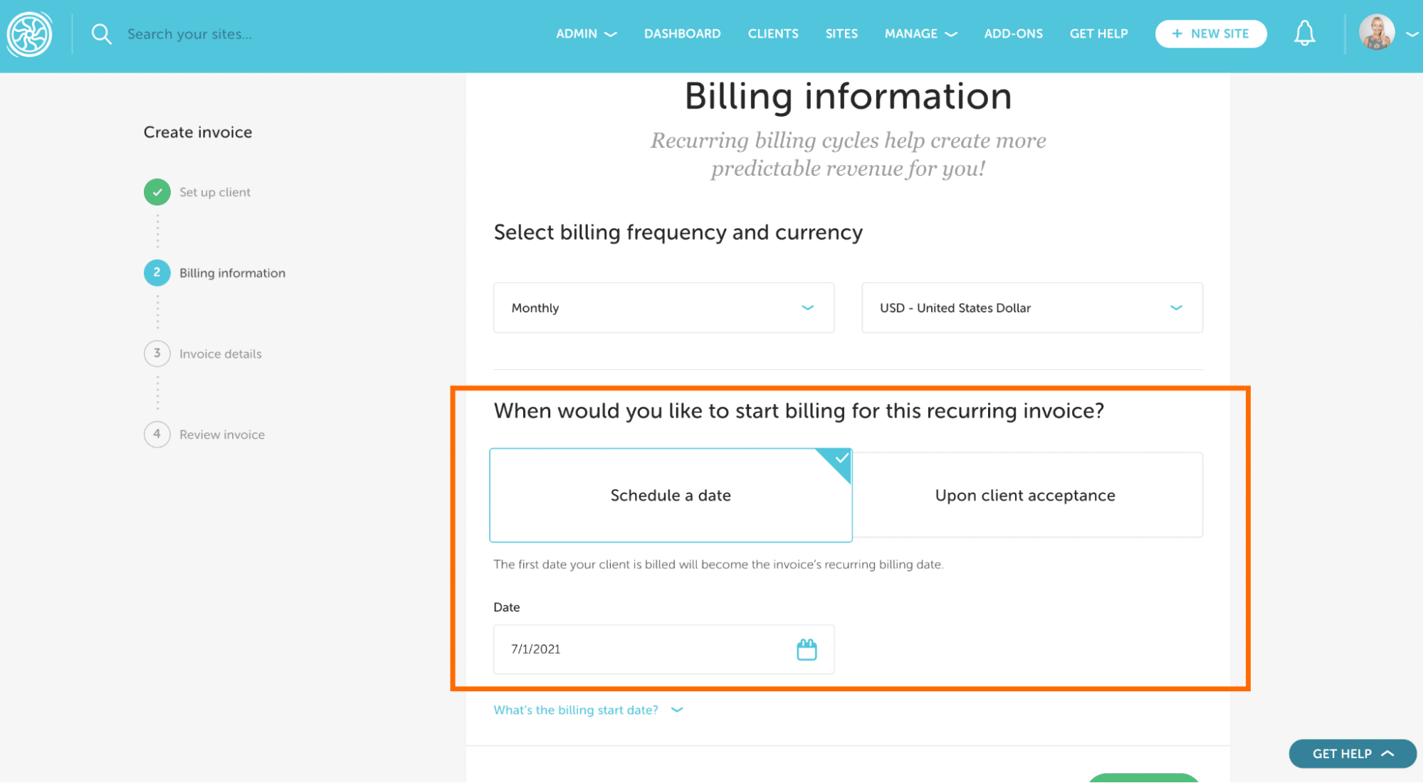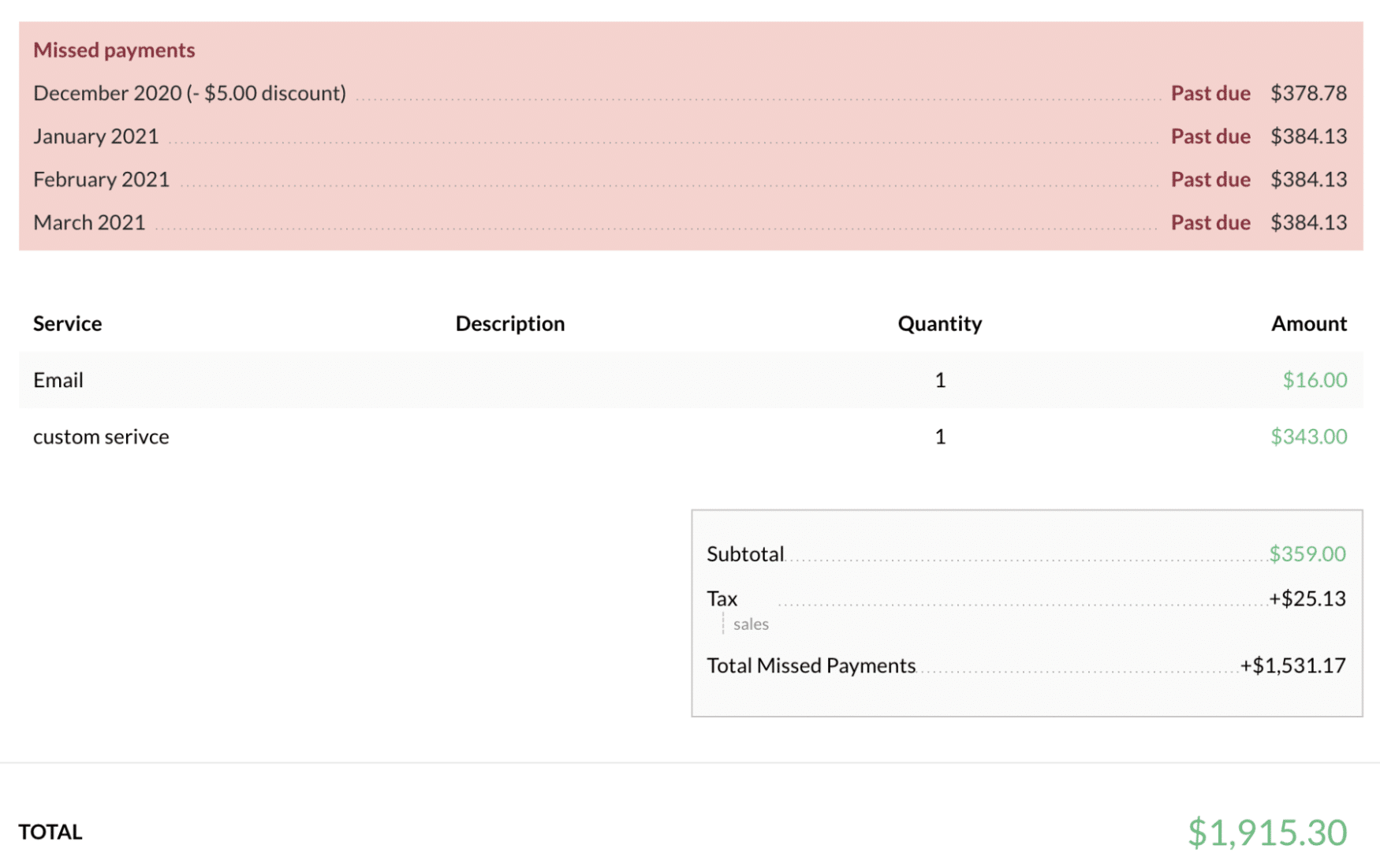 What if your client doesn’t approve the invoice before the scheduled due date? No worries, Growth Suite will backdate the invoice once they log in and accept it. Here is an example of a client who missed 4 monthly billing cycles before accepting the invoice: