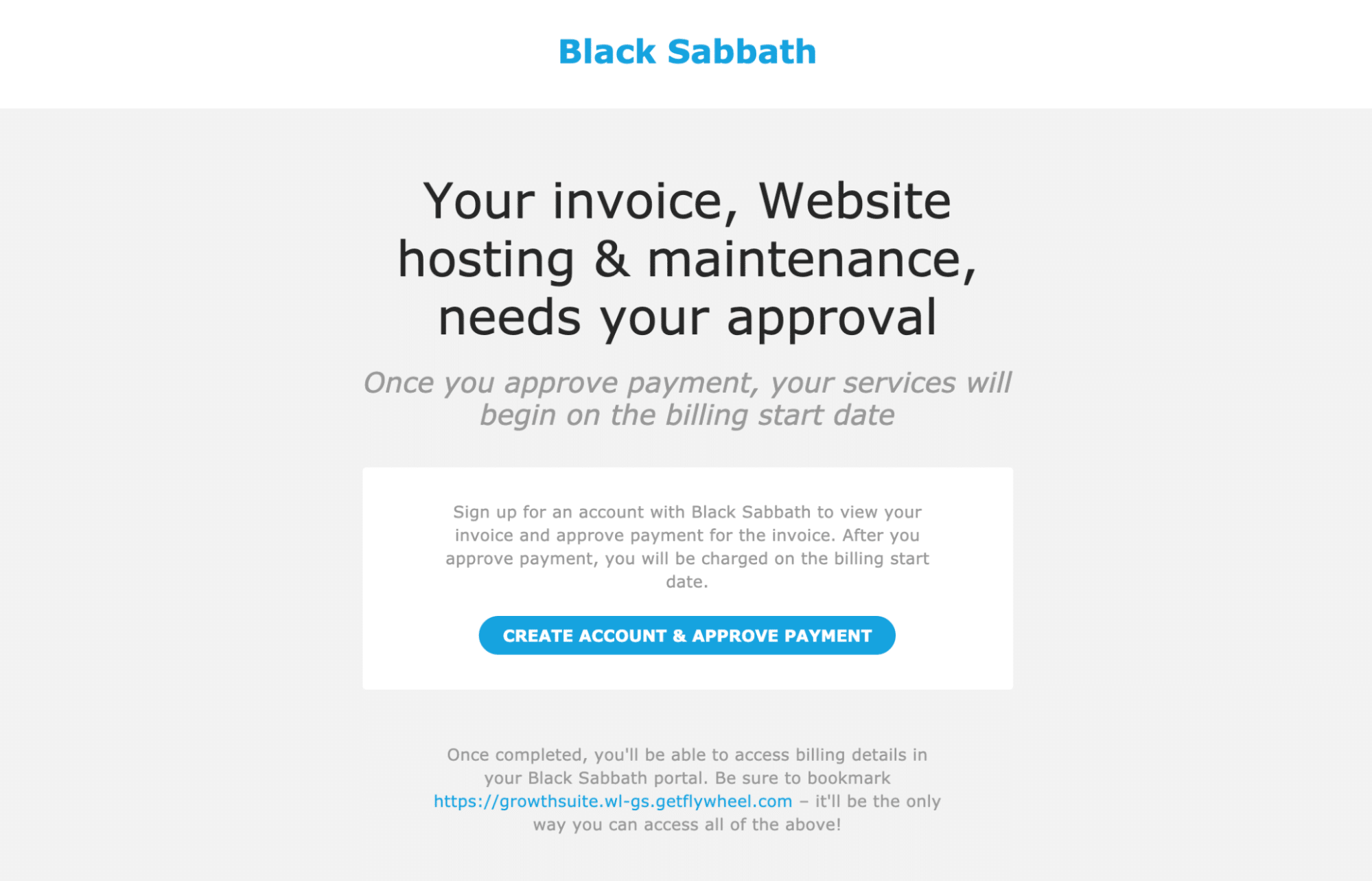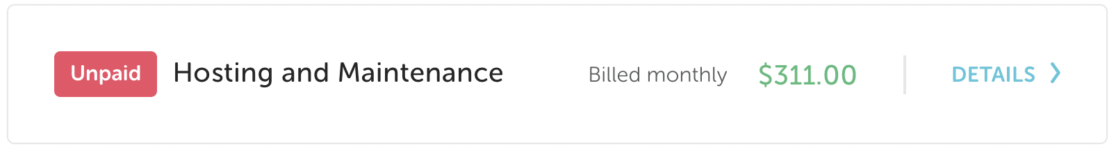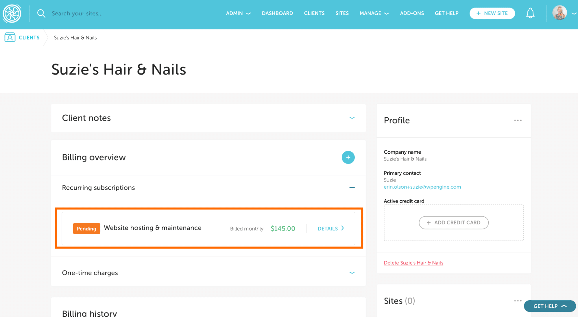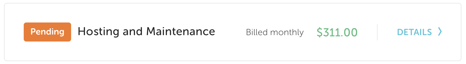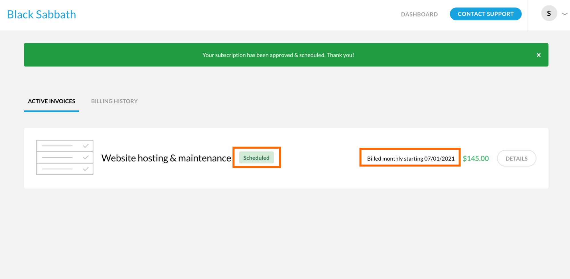This subscription is awaiting client action. Your client has been notified to log into the client portal and accept the invoice as well as upload a payment method if there isn’t already one on file.
