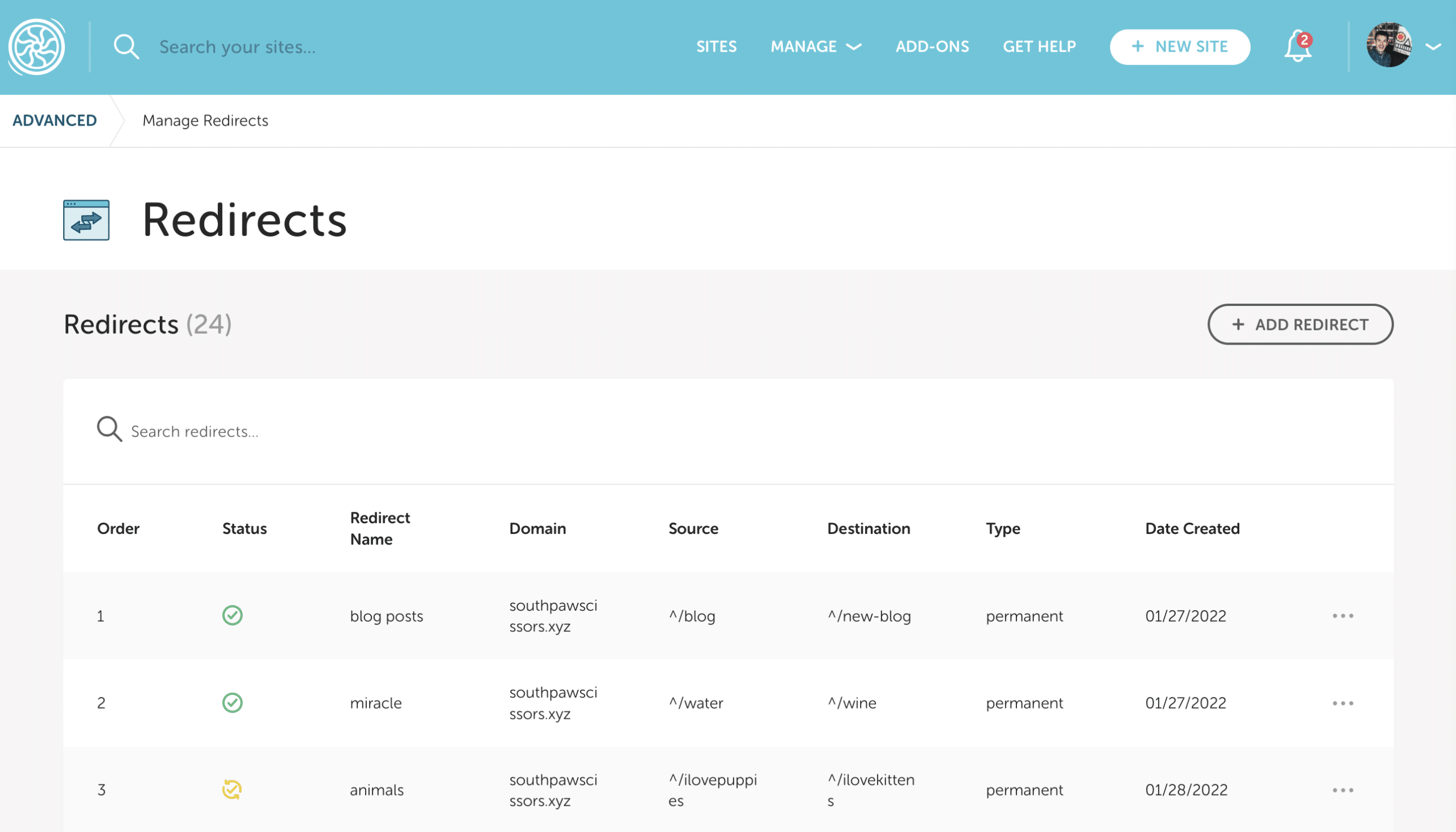 For more complex redirects or redirects that involve static files, Flywheel support can enable the redirects for you.