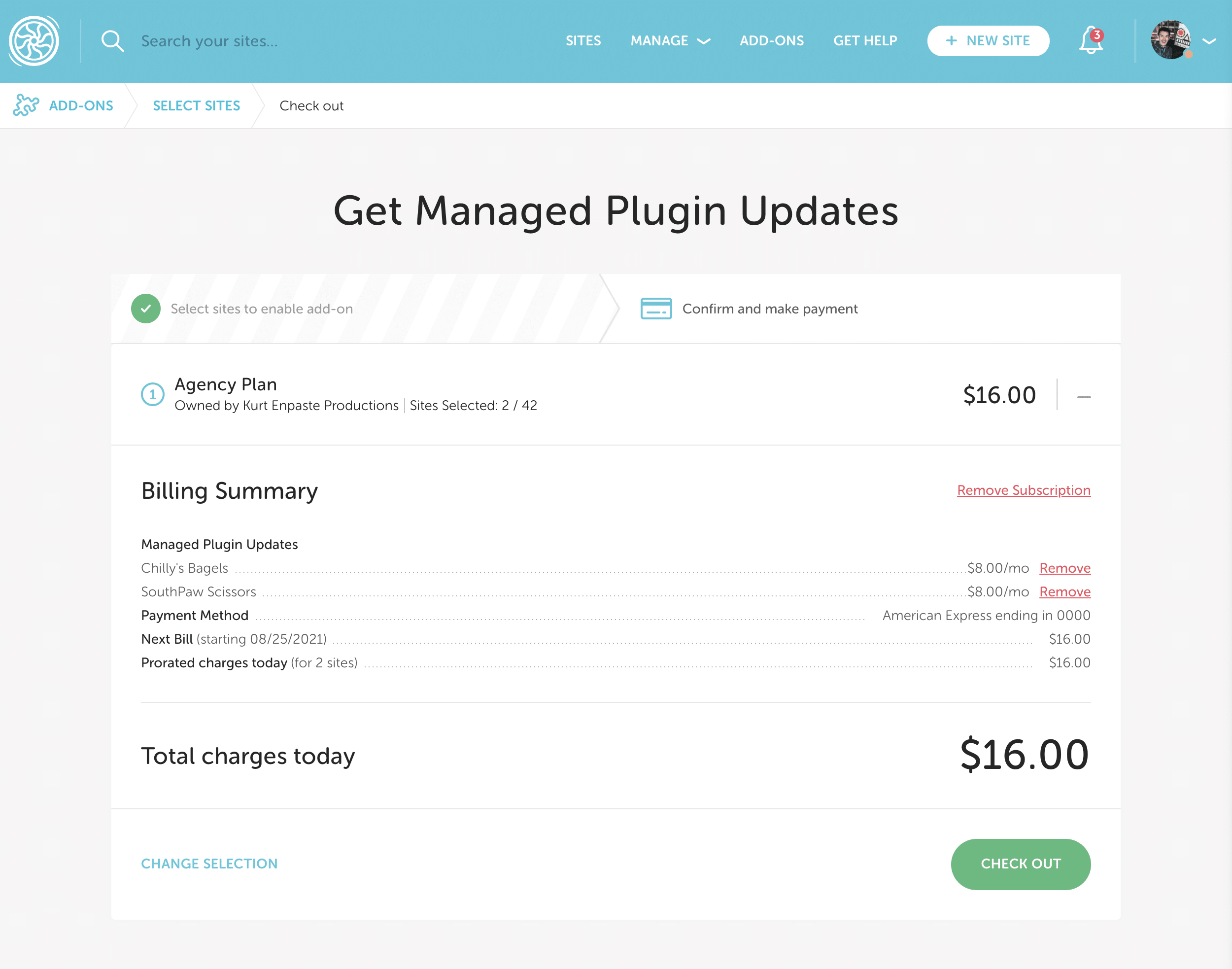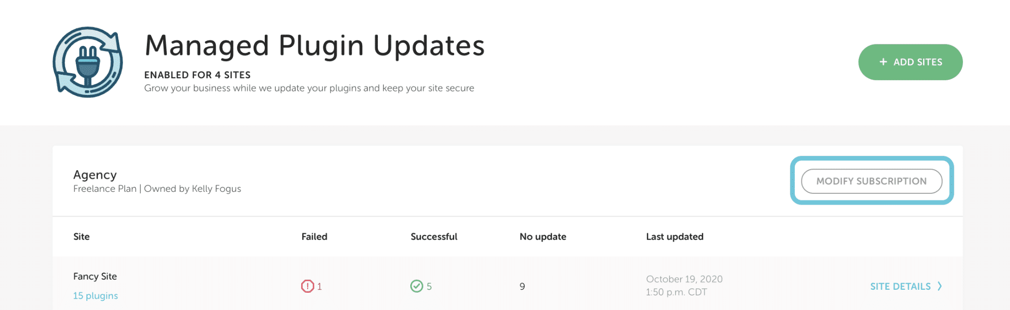 Once you’ve signed up for Managed Plugin Updates, you can easily add or remove sites at any time.
