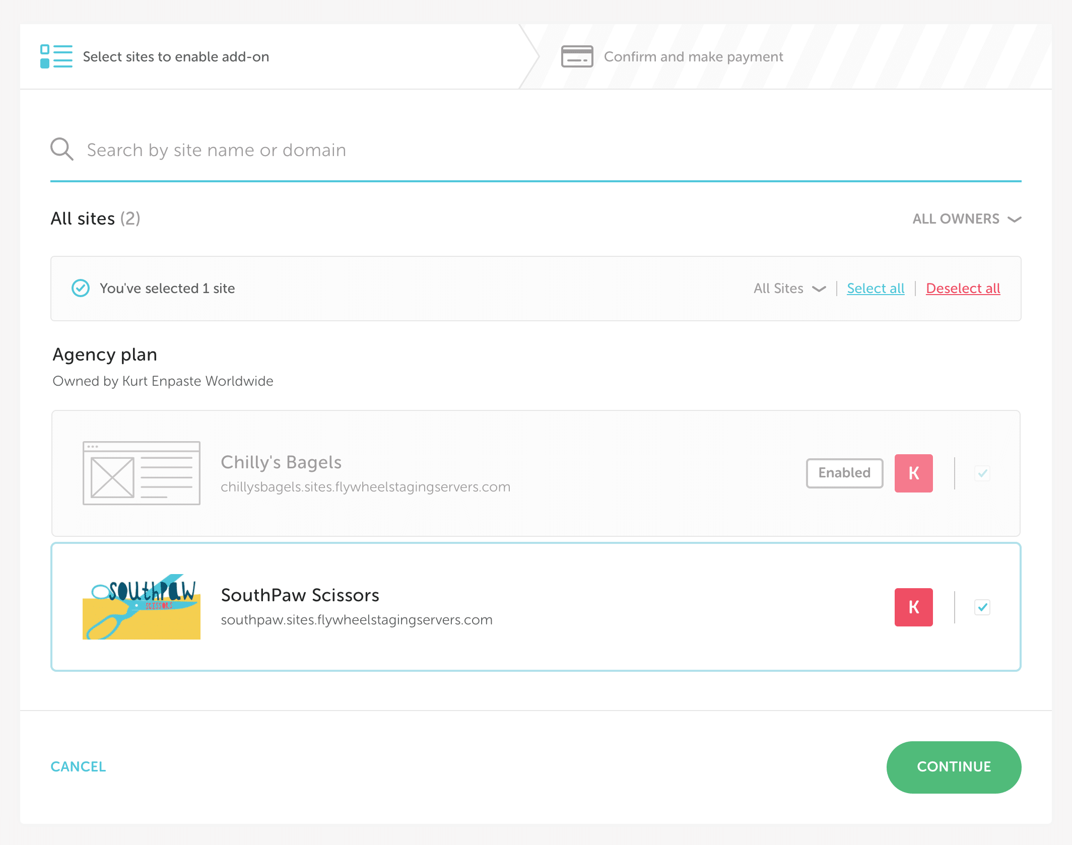 3. Check the box next to the site(s) you would like to enroll in Managed Plugin Updates and click Continue.