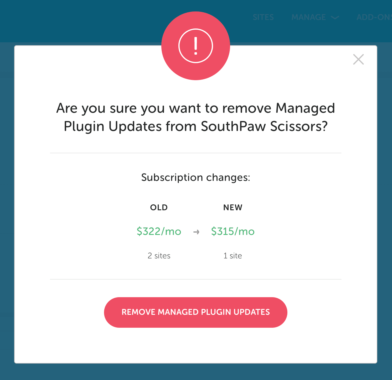 4. A modal will pop-up, displaying any changes to your bill. Click the Remove Managed Plugin Updates button to confirm.
