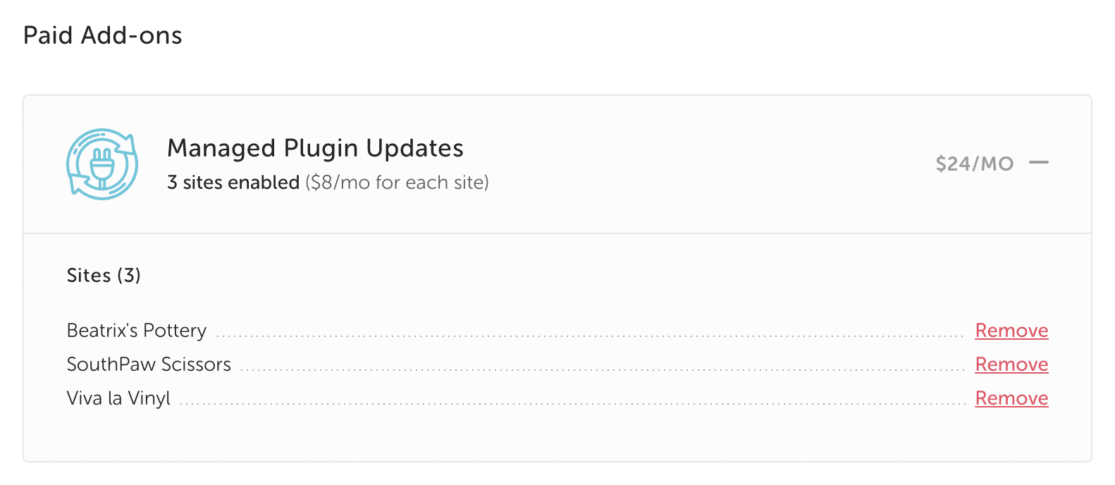 3. Under Subscription Details > Paid Add-ons, click Managed Plugin Updates to reveal the currently enabled sites. Click Remove next to the desired site.
