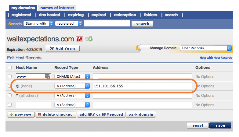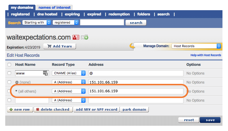 The default setup on eNom is to have all versions of your domain controlled by a single wildcard (*) A record. If you want subdomains of your domain to point to different websites, you’ll want to remove this record.