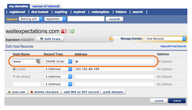 If you added the www version of your domain earlier, you’ll want to set up a CNAME record as well. A CNAME (aka canonical name) points a subdomain to another domain name.