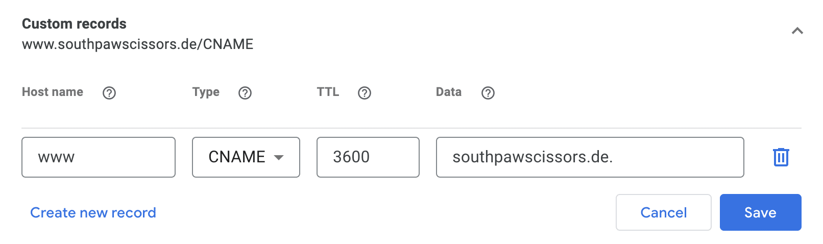 thisfinedomain.com.For more information, visit Google’s help article on CNAME records.