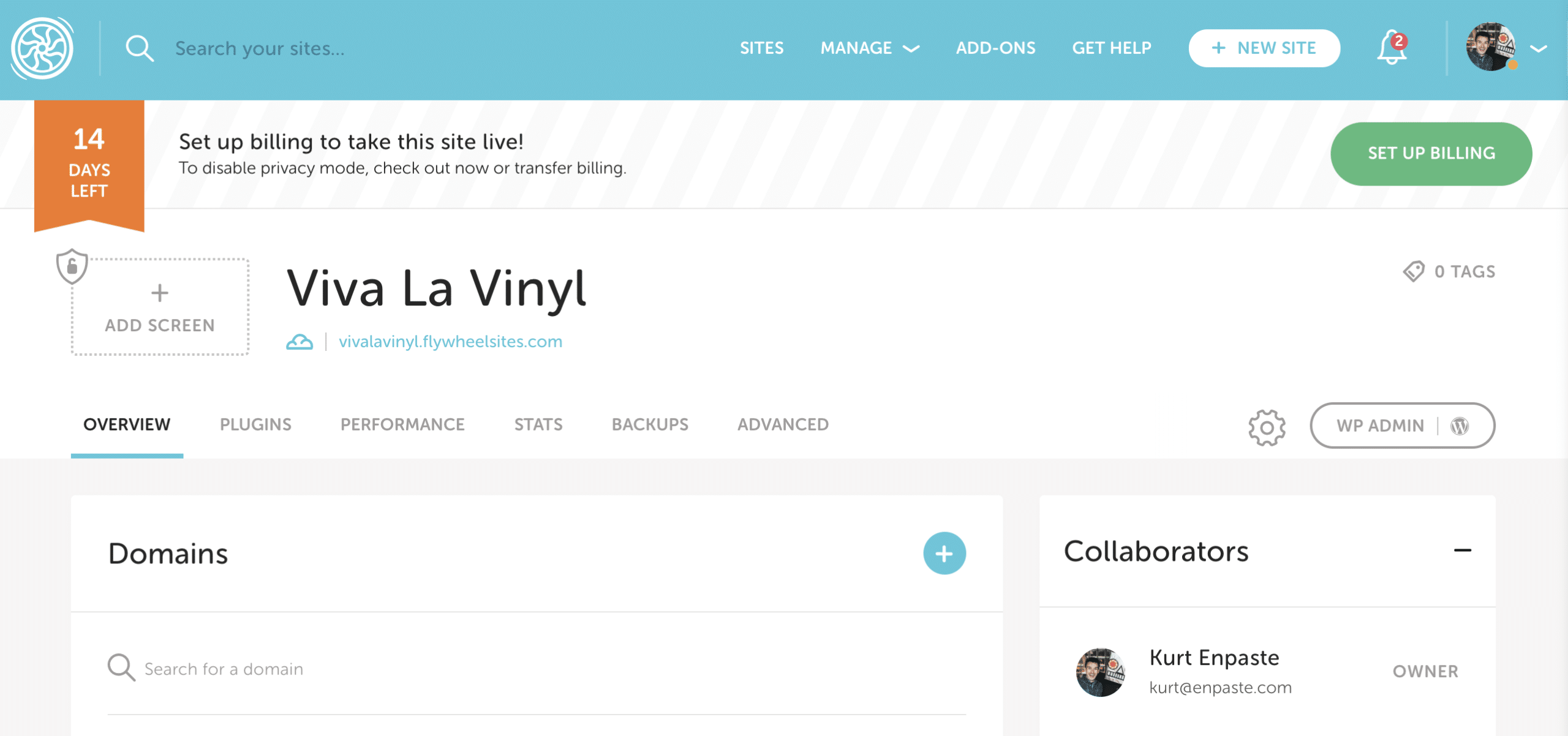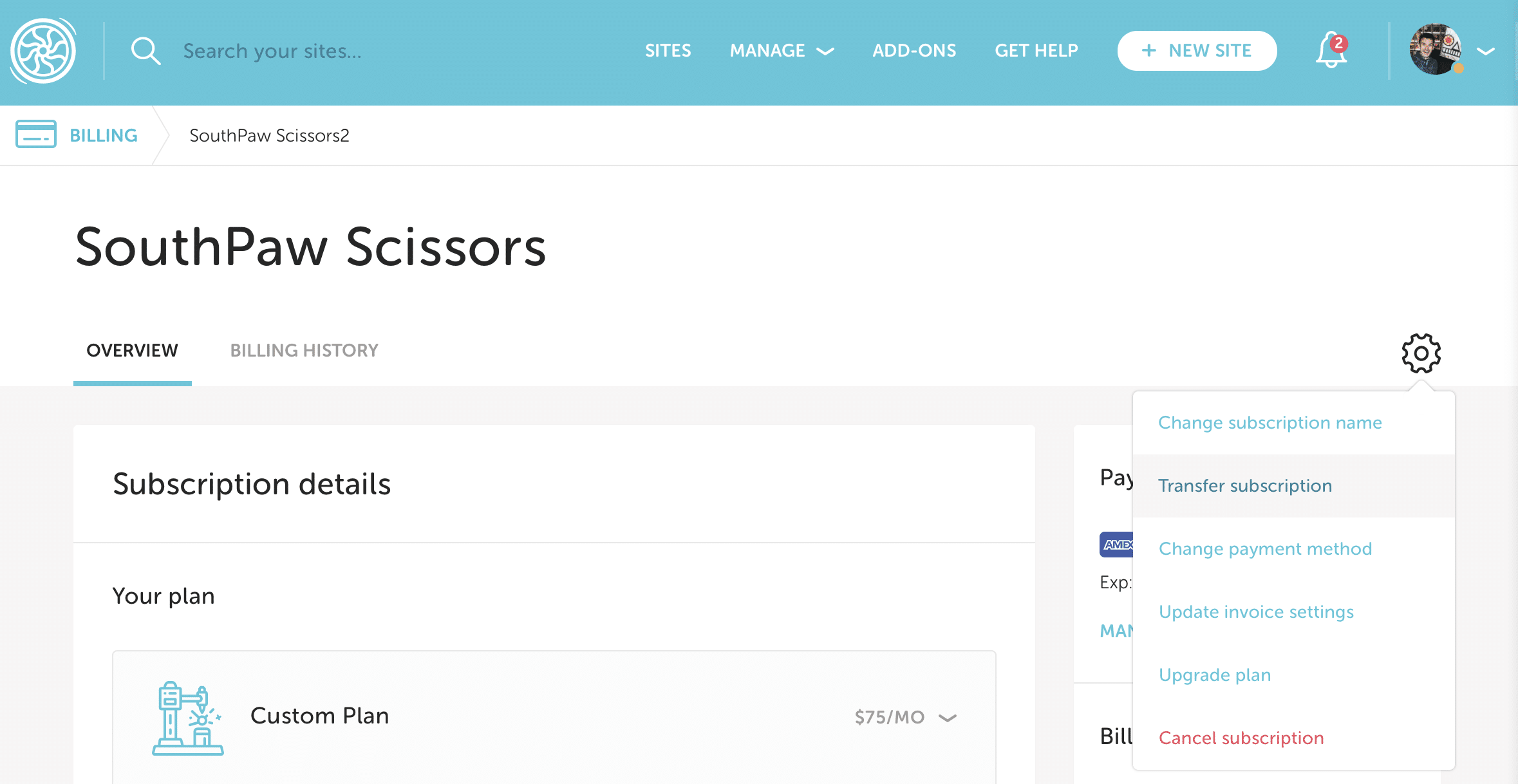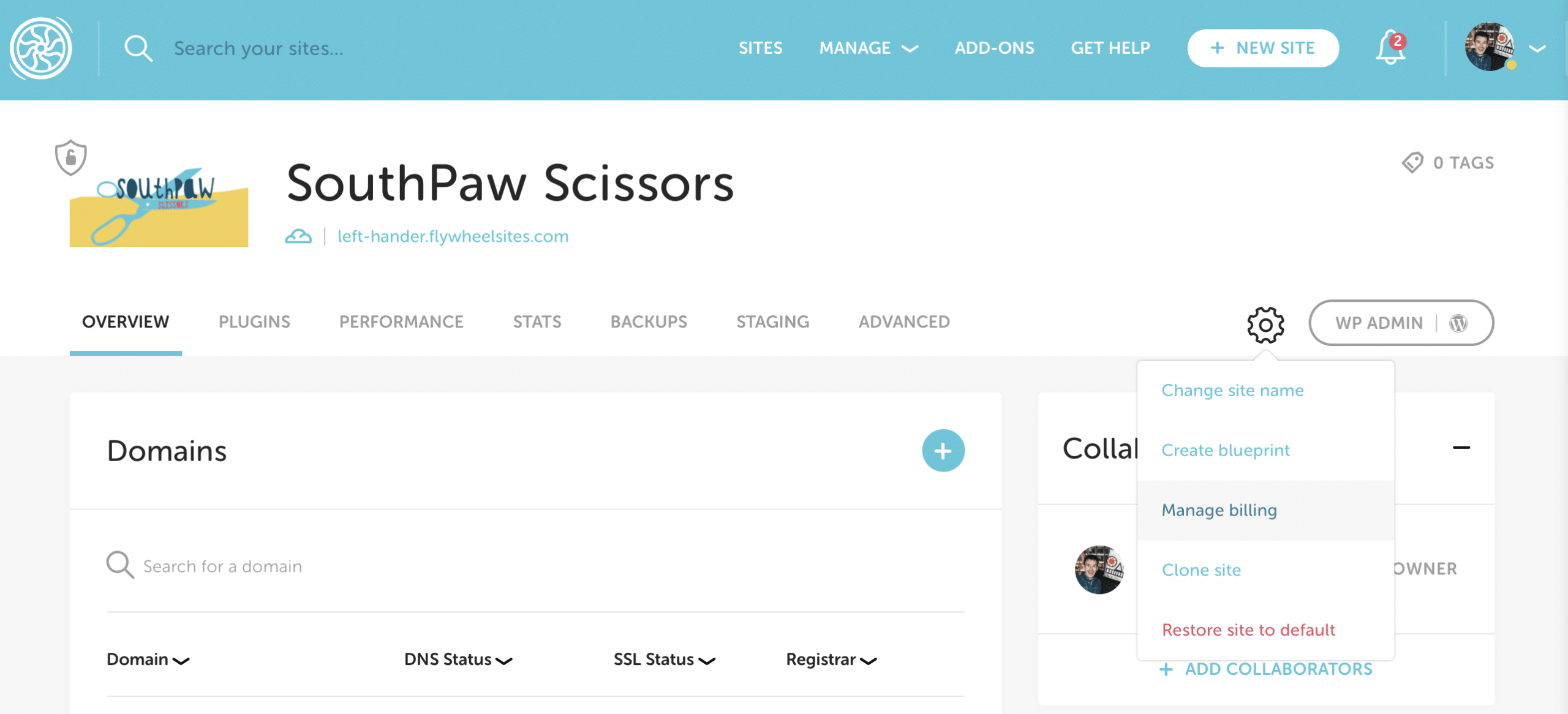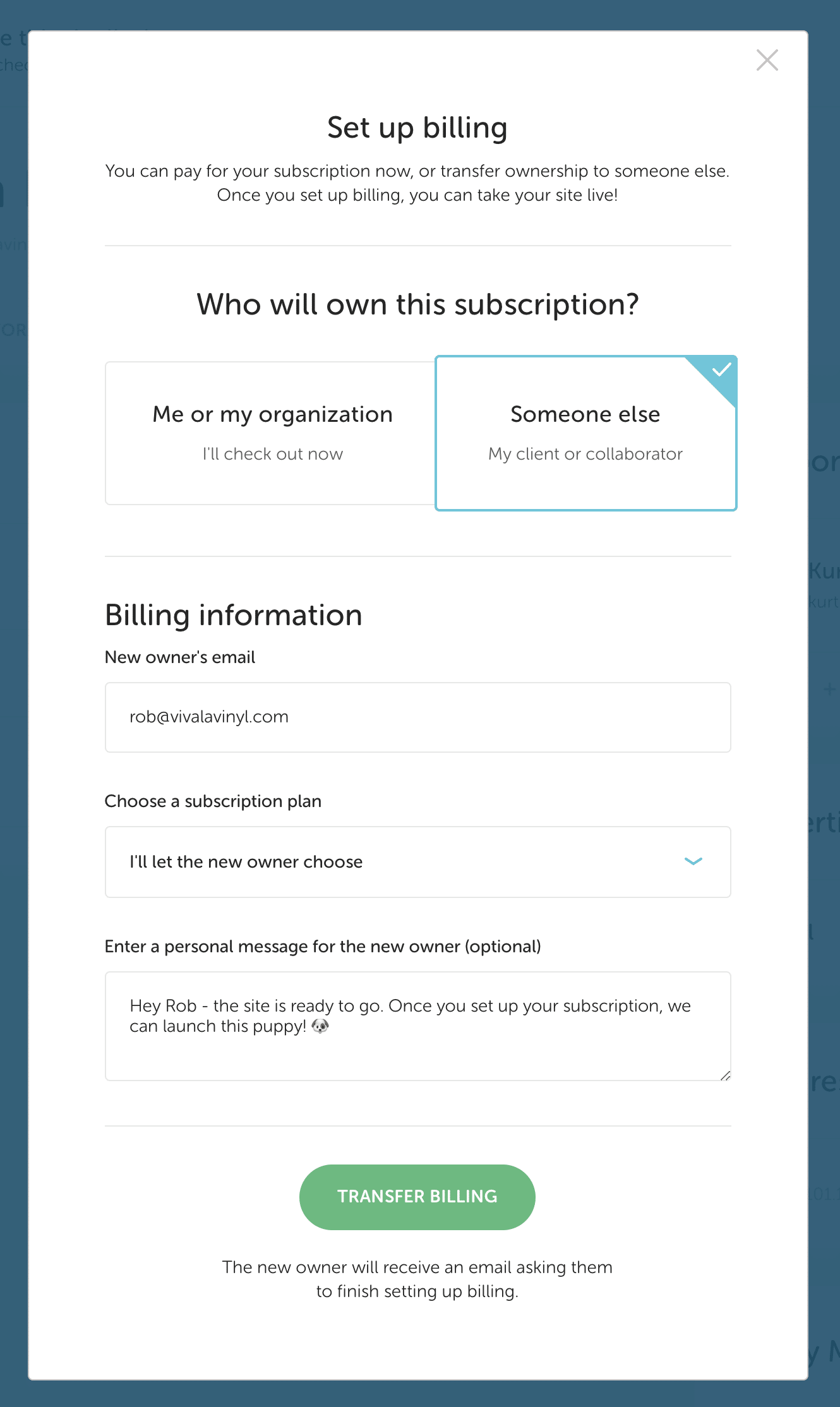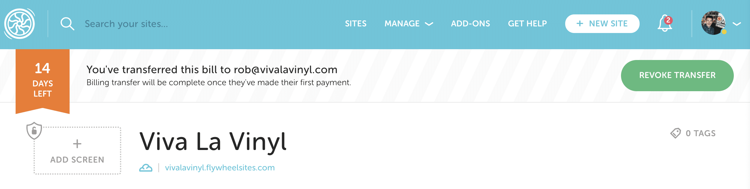 If you’d like your client to own the hosting subscription while you maintain access to the site as a collaborator, you can use Flywheel’s Transfer Billing feature. When you transfer billing, your client will receive an email asking them to complete billing on the appropriate site/subscription. Your client will be the subscription’s “owner” once they’ve paid.