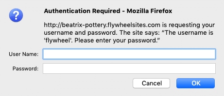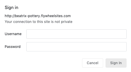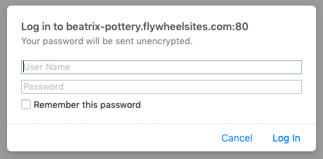 When a user visits a site on Flywheel that has Privacy Mode enabled, they’ll be presented with a login pop-up prompt.